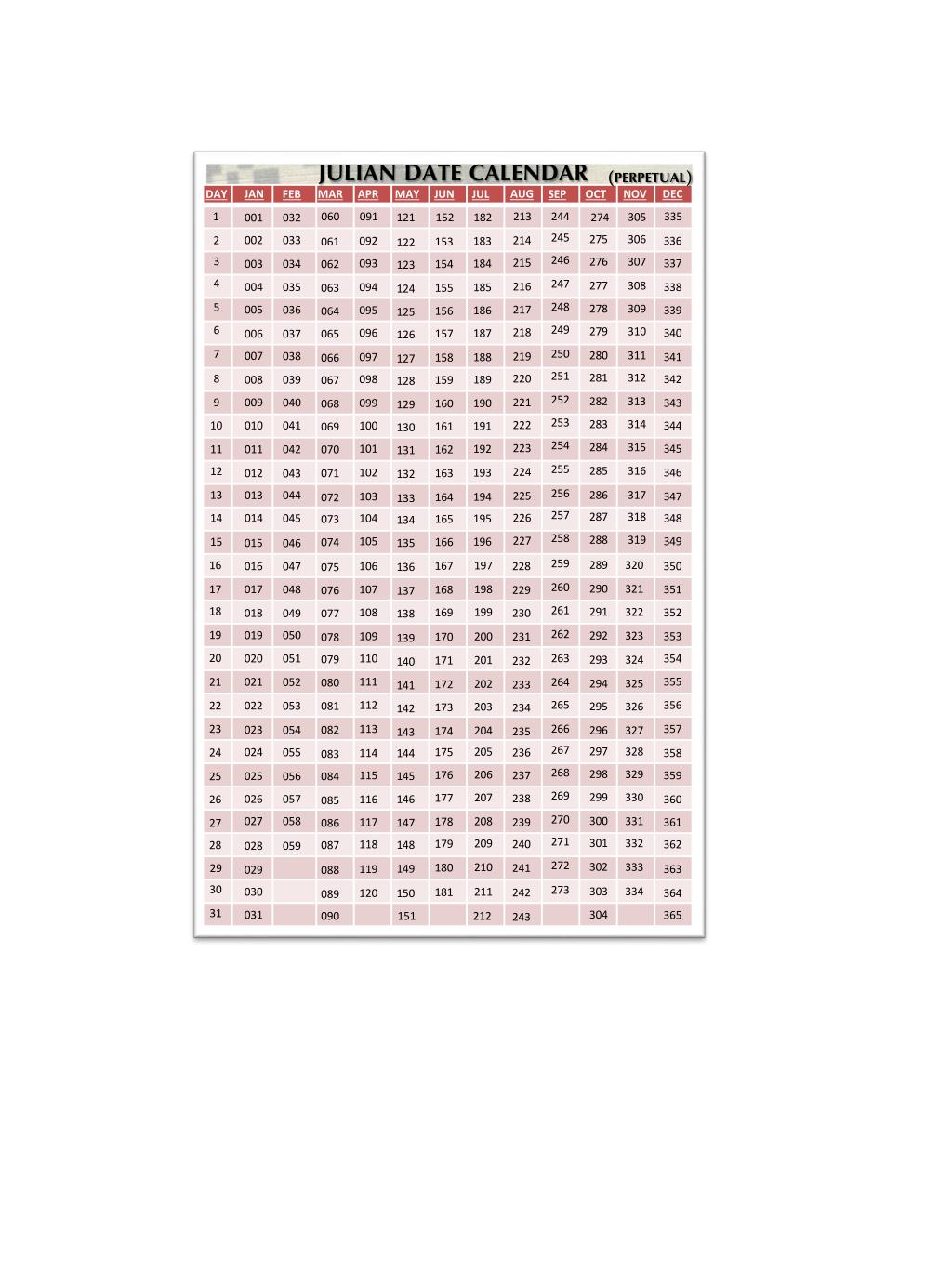 JULIAN DATE CALENDAR (PERPETUAL) DEC JAN AUG DAY SEP FEB APR JUN OCT MAR MAY JUL NOV 1 060 091 213 244 335 305 121 152 182 274 001 032 245 275 306 002 033 214 2 092 336 183 153 061 122 246 3 276 307 215 093 337 184 003 034 154 062 123 4 247 277 308 216 004 035 094 338 185 155 063 124 248 5 278 309 217 005 036 095 339 186 156 064 125 249 6 279 310 218 096 340 187 157 006 065 037 126 250 7 280 311 007 038 219 097 341 188 158 066 127 251 281 312 8 220 098 342 189 008 039 159 067 128 252 282 313 221 9 009 040 099 343 190 160 068 129 253 283 314 222 10 010 041 100 344 191 161 069 130 254 284 315 223 101 345 192 11 011 042 162 070 131 255 285 316 12 224 102 346 193 163 071 012 043 132 256 286 317 13 013 044 225 103 347 194 164 072 133 257 287 318 226 14 014 045 104 348 195 165 073 134 258 288 319 227 105 349 196 15 166 074 135 015 046 259 289 320 16 197 167 228 106 350 016 047 136 075 260 290 321 17 198 017 048 107 351 168 229 076 137 261 18 291 322 199 108 352 169 230 018 049 077 138 262 19 019 050 292 323 109 353 200 231 170 078 139 20 263 110 354 020 051 079 293 324 201 171 232 140 111 355 21 021 264 052 080 294 325 202 172 233 141 265 112 356 22 022 053 081 295 326 203 173 234 142 266 23 113 357 082 023 054 296 327 204 174 235 143 267 297 328 205 024 175 055 24 236 114 358 144 083 268 298 329 206 176 237 115 359 145 025 25 084 056 269 299 330 207 177 238 026 057 146 26 116 360 085 270 300 027 331 058 208 178 239 117 361 147 27 086 271 301 332 209 179 240 118 362 148 28 087 028 059 272 302 333 210 180 241 29 149 119 363 029 088 30 273 303 334 211 030 181 242 120 364 150 089 31 304 031 365 090 151 212 243