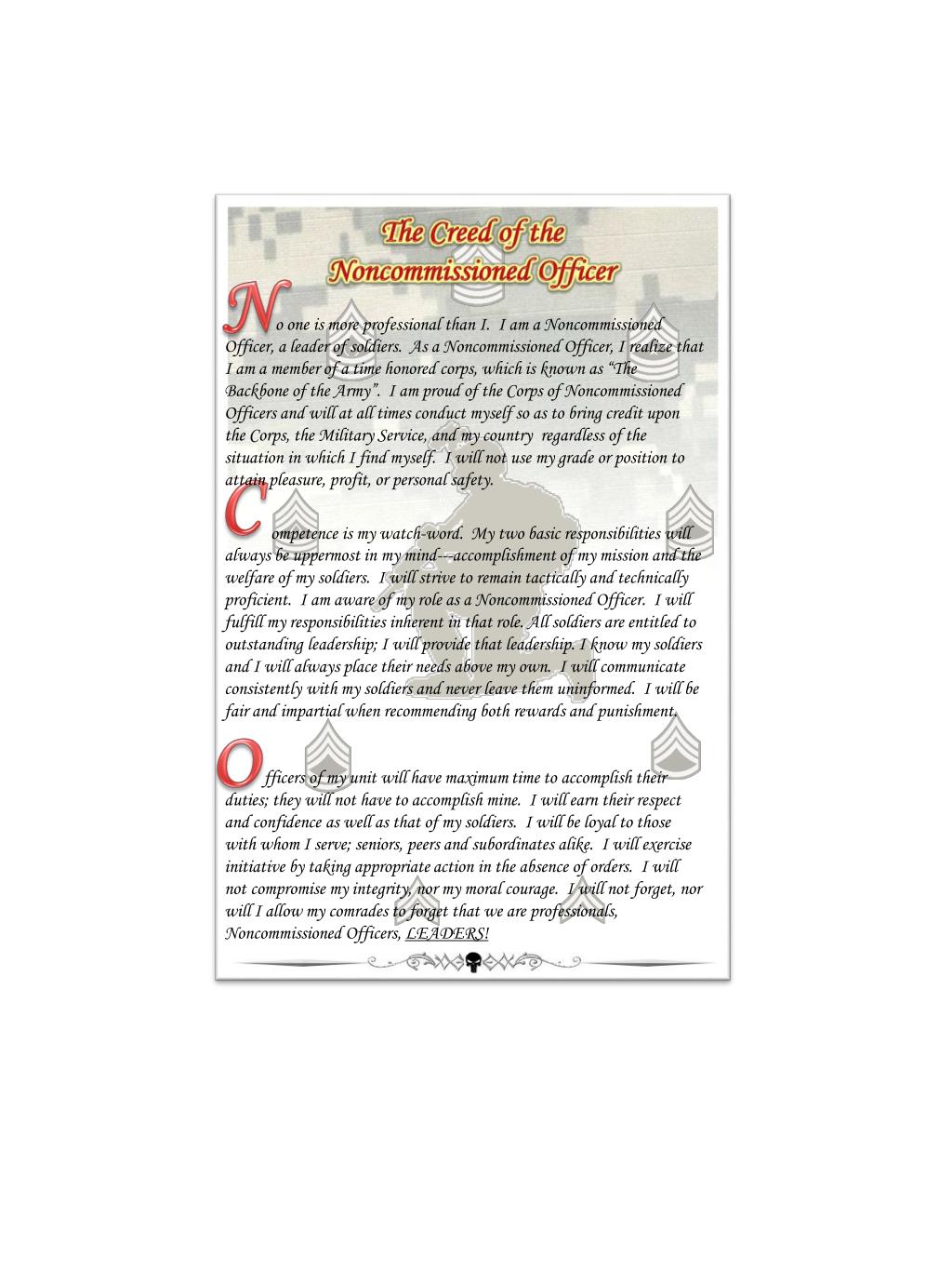 The Creed of the Noncommissioned Officer N o one is more professional than I. I am a Noncommissioned Officer, a leader ofsoldiers. As a Noncommissioned Officer, I realize that I am a member of a time honored corps, which is known as “The Backbone of the Army”. I am proud of the Corps of Noncommissioned Officers and will at all times conduct myself so as to bring credit upon the Corps, the Military Service, and my country regardless of the situation in which I find myself. I will not use my grade or position to attain pleasure, profit, or personal safety. ompetenceis my watch-word. My two basic responsibilities will always be uppermost in my mind---accomplishment of my mission and the welfare of my soldiers. I will strive to remain tactically and technically proficient. I am aware of my role as a Noncommissioned Officer. I will fulfill my responsibilities inherent in that role. All soldiers are entitled to outstanding leadership; I will provide that leadership. I know my soldiers and I will always place their needs above my own. I will communicate consistently with my soldiers and never leave them uninformed. I will be fair and impartial when recommending both rewards and punishment. fficersof my unit will have maximum time to accomplish their duties; they will not have to accomplish mine. I will earn their respect and confidence as well as that of my soldiers. I will be loyal to those with whom I serve; seniors, peers and subordinates alike. I will exercise initiative by taking appropriate action in the absence of orders. I will not compromise my integrity, nor my moral courage. I will not forget, nor will I allow my comrades to forget that we are professionals, Noncommissioned Officers, LEADERS! C O