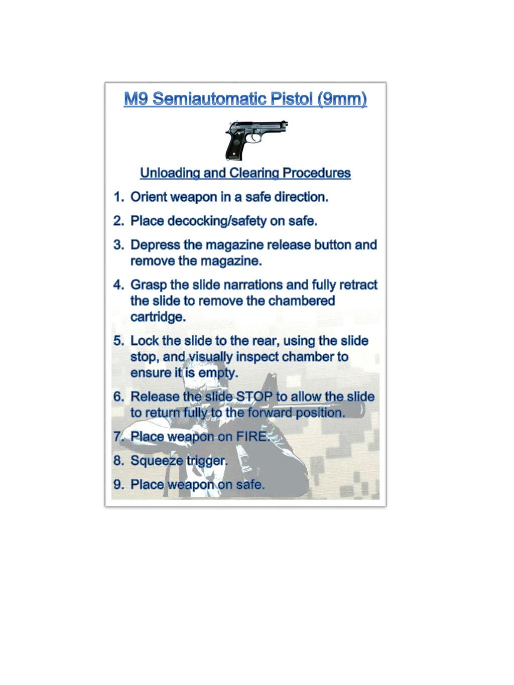 M9 Semiautomatic Pistol (9mm) Unloading and Clearing Procedures Orient weapon in a safe direction. Place decocking/safety on safe. Depress the magazine release button and remove the magazine. Grasp the slide narrations and fully retract the slide to remove the chambered cartridge. Lock the slide to the rear, using the slide stop, and visually inspect chamber to ensure it is empty. Release the slide STOP to allow the slide to return fully to the forward position. Place weapon on FIRE. Squeeze trigger. Place weapon on safe.