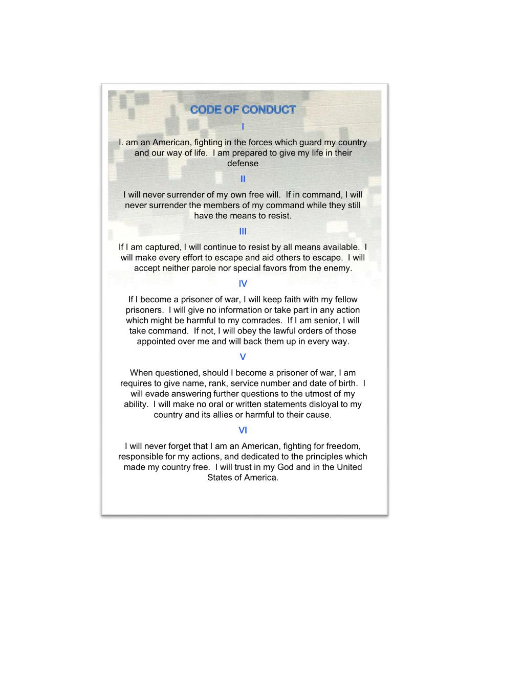 CODE OF CONDUCT I I. am an American, fighting in the forces which guard my country and our way of life. I am prepared to give my life in their defense II I will never surrender of my own free will. If in command, I will never surrender the members of my command while they still have the means to resist. III If I am captured, I will continue to resist by all means available. I will make every effort to escape and aid others to escape. I will accept neither parole nor special favors from the enemy. IV If I become a prisoner of war, I will keep faith with my fellow prisoners. I will give no information or take part in any action which might be harmful to my comrades. If I am senior, I will take command. If not, I will obey the lawful orders of those appointed over me and will back them up in every way. V When questioned, should I become a prisoner of war, I am requires to give name, rank, service number and date of birth. I will evade answering further questions to the utmost of my ability. I will make no oral or written statements disloyal to my country and its allies or harmful to their cause. VI I will never forget that I am an American, fighting for freedom, responsible for my actions, and dedicated to the principles which made my country free. I will trust in my God and in the United States of America.