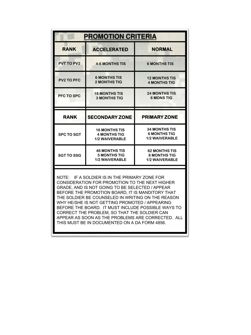 PROMOTION CRITERIA RANK NORMAL ACCELERATED PVT TO PV2 4-6 MONTHS TIS 6 MONTHS TIS 6 MONTHS TIS 2 MONTHS TIG 12 MONTHS TIS 4 MONTHS TIG PV2 TO PFC 24 MONTHS TIS 6 MONS TIG 18 MONTHS TIS 3 MONTHS TIG PFC TO SPC PRIMARY ZONE RANK SECONDARY ZONE 34MONTHS TIS 6MONTHS TIG 1/2 WAIVERABLE 16 MONTHS TIS 4 MONTHS TIG 1/2 WAIVERABLE SPC TO SGT 46MONTHS TIS 5MONTHS TIG 1/2 WAIVERABLE 82MONTHS TIS 8MONTHS TIG 1/2 WAIVERABLE SGT TO SSG NOTE: IF A SOLDIER IS IN THE PRIMARY ZONE FOR CONSIDERATION FOR PROMOTION TO THE NEXT HIGHER GRADE, AND IS NOT GOING TO BE SELECTED / APPEAR BEFORE THE PROMOTION BOARD, IT IS MANDITORY THAT THE SOLDIER BE COUNSELED IN WRITING ON THE REASON WHY HE/SHE IS NOT GETTING PROMOTED / APPEARING BEFORE THE BOARD. IT MUST INCLUDE POSSIBLE WAYS TO CORRECT THE PROBLEM, SO THAT THE SOLDIER CAN APPEAR AS SOON AS THE PROBLEMS ARE CORRECTED. ALL THIS MUST BE IN DOCUMENTED ON A DA FORM 4856.