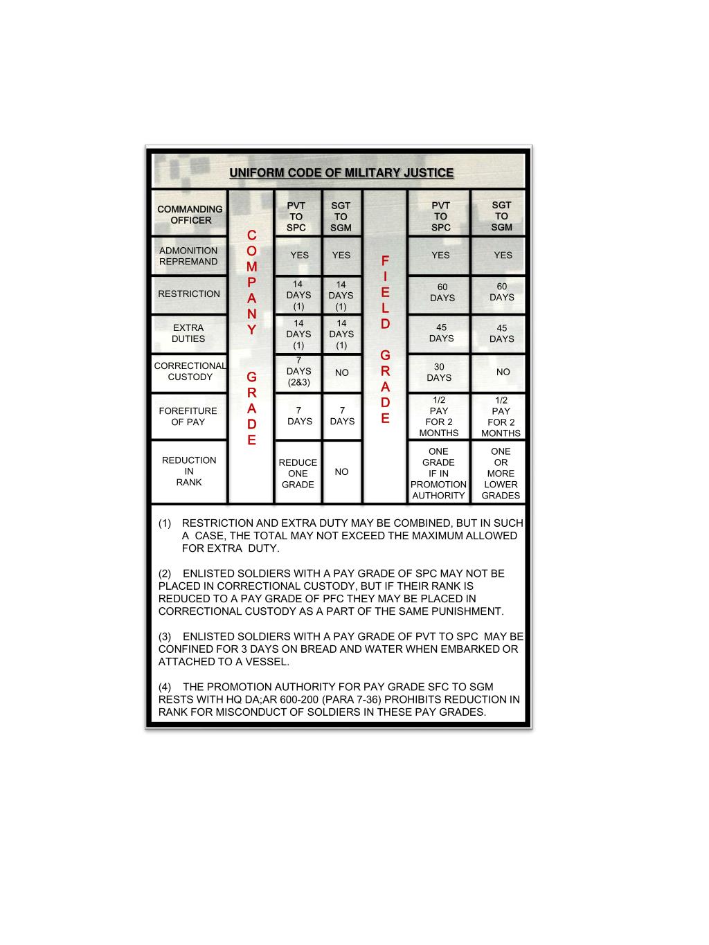UNIFORM CODE OF MILITARY JUSTICE SGT TO SGM PVT TO SPC PVT TO SPC SGT TO SGM COMMANDING OFFICER C O M P A N Y GRADE ADMONITION REPREMAND YES YES YES YES FIELD GRADE 14 DAYS (1) 14 DAYS (1) 60 DAYS 60 DAYS RESTRICTION 14 DAYS (1) 14 DAYS (1) 45 DAYS EXTRA DUTIES 45 DAYS 7 DAYS (2&3) CORRECTIONAL CUSTODY 30 DAYS NO NO 1/2 PAY FOR 2 MONTHS 1/2 PAY FOR 2 MONTHS 7 DAYS 7 DAYS FOREFITURE OF PAY ONE GRADE IF IN PROMOTION AUTHORITY ONE OR MORE LOWER GRADES REDUCTION IN RANK REDUCE ONE GRADE NO RESTRICTION AND EXTRA DUTY MAY BE COMBINED, BUT IN SUCH A CASE, THE TOTAL MAY NOT EXCEED THE MAXIMUM ALLOWED FOR EXTRA DUTY. (2) ENLISTED SOLDIERS WITH A PAY GRADE OF SPC MAY NOT BE PLACED IN CORRECTIONAL CUSTODY, BUT IF THEIR RANK IS REDUCED TO A PAY GRADE OF PFC THEY MAY BE PLACED IN CORRECTIONAL CUSTODY AS A PART OF THE SAME PUNISHMENT. (3) ENLISTED SOLDIERS WITH A PAY GRADE OF PVT TO SPC MAY BE CONFINED FOR 3 DAYS ON BREAD AND WATER WHEN EMBARKED OR ATTACHED TO A VESSEL. (4) THE PROMOTION AUTHORITY FOR PAY GRADE SFC TO SGM RESTS WITH HQ DA;AR 600-200 (PARA 7-36) PROHIBITS REDUCTION IN RANK FOR MISCONDUCT OF SOLDIERS IN THESE PAY GRADES.