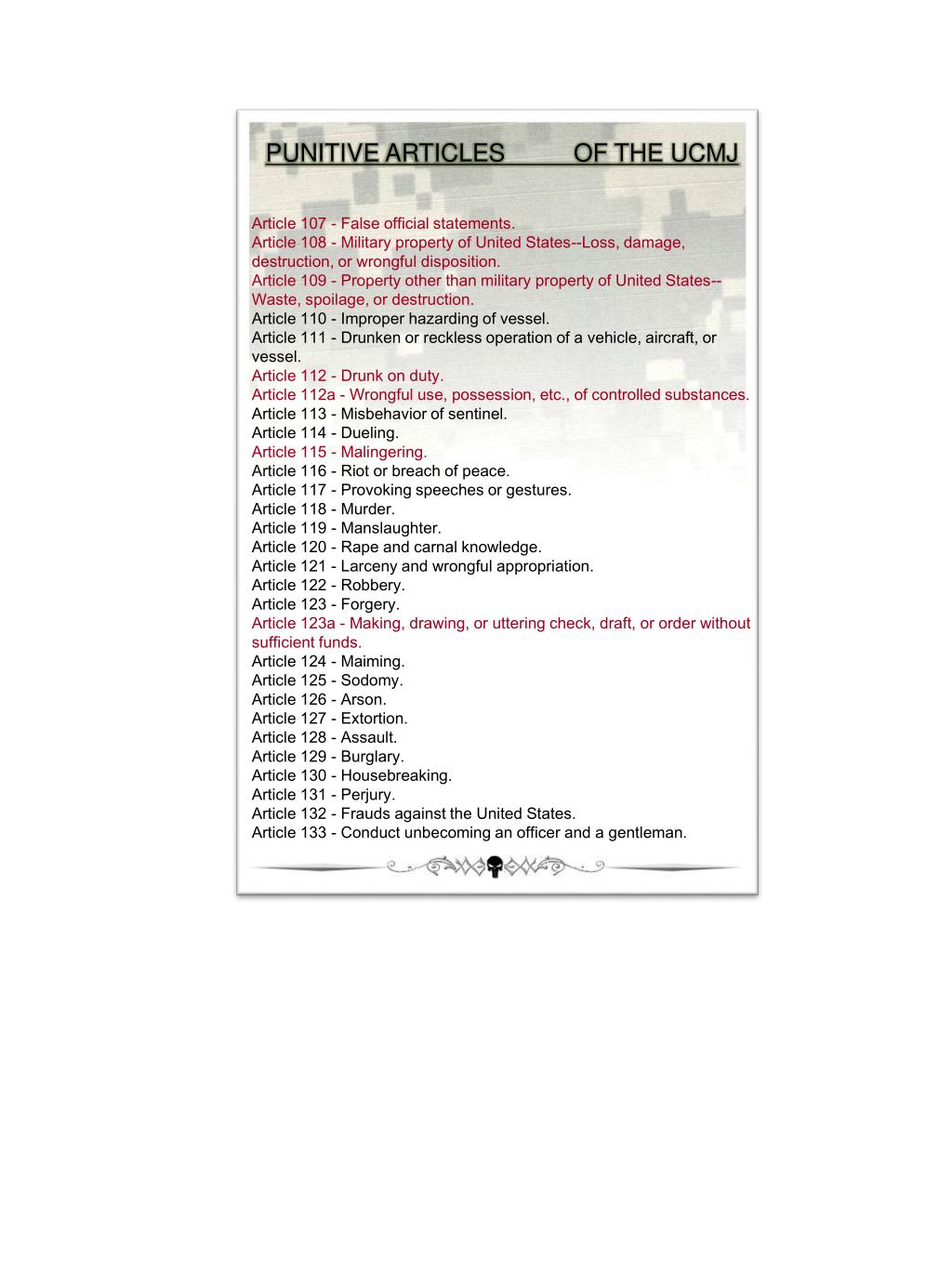 PUNITIVE ARTICLES OF THE UCMJ Article 107 - False official statements. Article 108 - Military property of United States--Loss, damage, destruction, or wrongful disposition. Article 109 - Property other than military property of United States--Waste, spoilage, or destruction. Article 110 - Improper hazarding of vessel. Article 111 - Drunken or reckless operation of a vehicle, aircraft, or vessel. Article 112 - Drunk on duty. Article 112a - Wrongful use, possession, etc., of controlled substances. Article 113 - Misbehavior of sentinel. Article 114 - Dueling. Article 115 - Malingering. Article 116 - Riot or breach of peace. Article 117 - Provoking speeches or gestures. Article 118 - Murder. Article 119 - Manslaughter. Article 120 - Rape and carnal knowledge. Article 121 - Larceny and wrongful appropriation. Article 122 - Robbery. Article 123 - Forgery. Article 123a - Making, drawing, or uttering check, draft, or order without sufficient funds.Article 124 - Maiming. Article 125 - Sodomy. Article 126 - Arson. Article 127 - Extortion. Article 128 - Assault. Article 129 - Burglary. Article 130 - Housebreaking. Article 131 - Perjury. Article 132 - Frauds against the United States. Article 133 - Conduct unbecoming an officer and a gentleman.