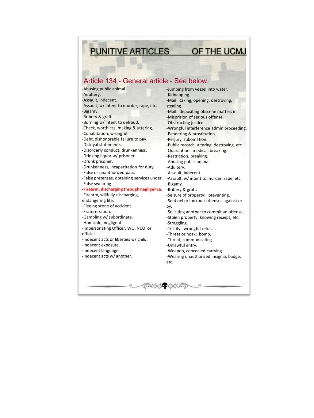 PUNITIVE ARTICLES OF THE UCMJ Article 134 - General article - See below. -Abusing public animal. -Adultery. -Assault, indecent. -Assault, w/ intent to murder, rape, etc. -Bigamy. -Bribery & graft. -Burning w/ intent to defraud. -Check, worthless, making & uttering. -Cohabitation, wrongful. -Debt, dishonorable failure to pay. -Disloyal statements. -Disorderly conduct, drunkenness. -Drinking liquor w/ prisoner. -Drunk prisoner. -Drunkenness, incapacitation for duty. -False or unauthorized pass. -False pretenses, obtaining services under. -False swearing. -Firearm, discharging through negligence. -Firearm, willfully discharging, endangering life. -Fleeing scene of accident. -Fraternization. -Gambling w/ subordinate. -Homicide, negligent. -Impersonating Officer, WO, NCO, or official. -Indecent acts or liberties w/ child. -Indecent exposure. -Indecent language. -Indecent acts w/ another. -Jumping from vessel into water. -Kidnapping. -Mail: taking, opening, destroying, stealing. -Mail: depositing obscene matters in. -Misprision of serious offense. -Obstructing justice. -Wrongful interference admin proceeding. -Pandering & prostitution. -Perjury, subomation. -Public record: altering, destroying, etc. -Quarantine: medical, breaking. -Restriction, breaking. -Abusing public animal. -Adultery. -Assault, indecent. -Assault, w/ intent to murder, rape, etc. -Bigamy. -Bribery & graft. -Seizure of property: preventing. -Sentinel or lookout: offenses against or by. -Soliciting another to commit an offense. -Stolen property: knowing receipt, etc. -Straggling. -Testify: wrongful refusal. -Threat or hoax: bomb. -Threat, communicating. -Unlawful entry. -Weapon, concealed carrying. -Wearing unauthorized insignia, badge, etc.