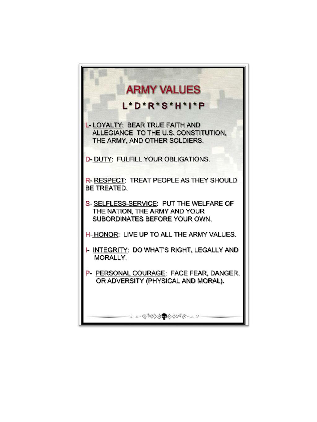 ARMY VALUES L * D * R * S * H * I * P L- LOYALTY: BEAR TRUE FAITH AND ALLEGIANCE TO THE U.S. CONSTITUTION, THE ARMY, AND OTHER SOLDIERS. D- DUTY: FULFILL YOUR OBLIGATIONS. R- RESPECT: TREAT PEOPLE AS THEY SHOULD BE TREATED. S- SELFLESS-SERVICE: PUT THE WELFARE OF THE NATION, THE ARMY AND YOUR SUBORDINATESBEFORE YOUR OWN. H- HONOR: LIVE UP TO ALL THE ARMY VALUES. I- INTEGRITY: DO WHAT’S RIGHT, LEGALLY AND MORALLY. P- PERSONAL COURAGE: FACE FEAR, DANGER, OR ADVERSITY (PHYSICAL AND MORAL).
