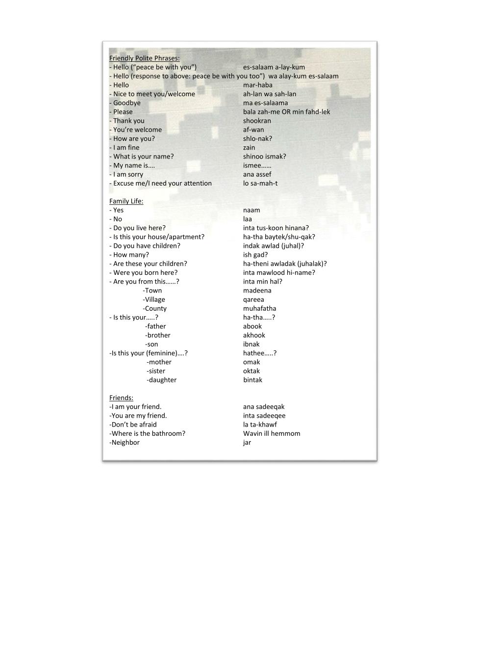 Friendly Polite Phrases: • - Hello (“peace be with you”) es-salaam a-lay-kum • Hello (response to above: peace be with you too”) waalay-kumes-salaam • Hello mar-haba • Nice to meet you/welcome ah-lanwasah-lan • Goodbye ma es-salaama • Please balazah-me OR min fahd-lek • Thank you shookran • You’re welcome af-wan • How are you? shlo-nak? • I am fine zain • What is your name? shinooismak? • My name is…. ismee…… • I am sorry anaassef • Excuse me/I need your attention lo sa-mah-t • Family Life: • Yes naam • No laa • Do you live here? intatus-koonhinana? • Is this your house/apartment? ha-thabaytek/shu-qak? • Do you have children? indakawlad (juhal)? • How many? ish gad? • Are these your children? ha-theniawladak (juhalak)? • Were you born here? intamawlood hi-name? • Are you from this……? inta min hal? • Town madeena • Village qareea • County muhafatha • Is this your…..? ha-tha…..? • -father abook • -brother akhook • -son ibnak • Is this your (feminine)….? hathee…..? • -mother omak • -sister oktak • -daughter bintak • Friends: • I am your friend. anasadeeqak • You are my friend. intasadeeqee • Don’t be afraid la ta-khawf • Where is the bathroom? Wavin ill hemmom • Neighbor jar
