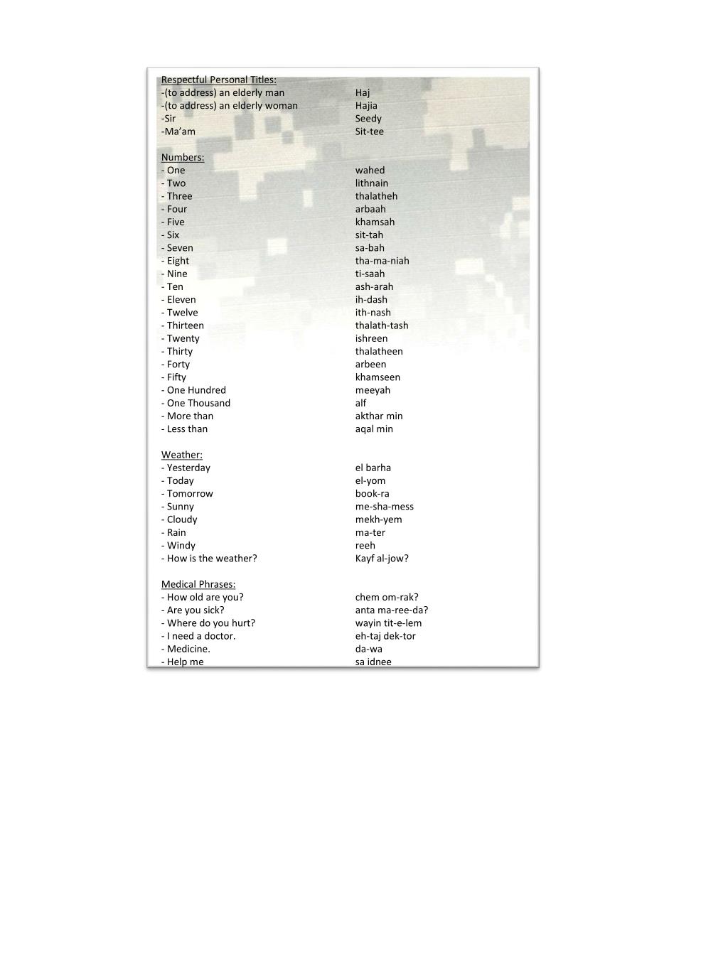 Respectful Personal Titles: • (to address) an elderly man Haj • (to address) an elderly woman Hajia • Sir Seedy • Ma’am Sit-tee • Numbers: • One wahed • Two lithnain • Three thalatheh • Four arbaah • Five khamsah • Six sit-tah • Seven sa-bah • Eight tha-ma-niah • Nine ti-saah • Ten ash-arah • Eleven ih-dash • Twelve ith-nash • Thirteen thalath-tash • Twenty ishreen • Thirty thalatheen • Forty arbeen • Fifty khamseen • One Hundred meeyah • One Thousand alf • More than akthar min • Less than aqal min • Weather: • Yesterday el barha • Today el-yom • Tomorrow book-ra • Sunny me-sha-mess • Cloudy mekh-yem • Rain ma-ter • Windy reeh • How is the weather? Kayf al-jow? • Medical Phrases: • How old are you? chemom-rak? • Are you sick? anta ma-ree-da? • Where do you hurt? wayin tit-e-lem • I need a doctor. eh-tajdek-tor • Medicine. da-wa • Help me saidnee