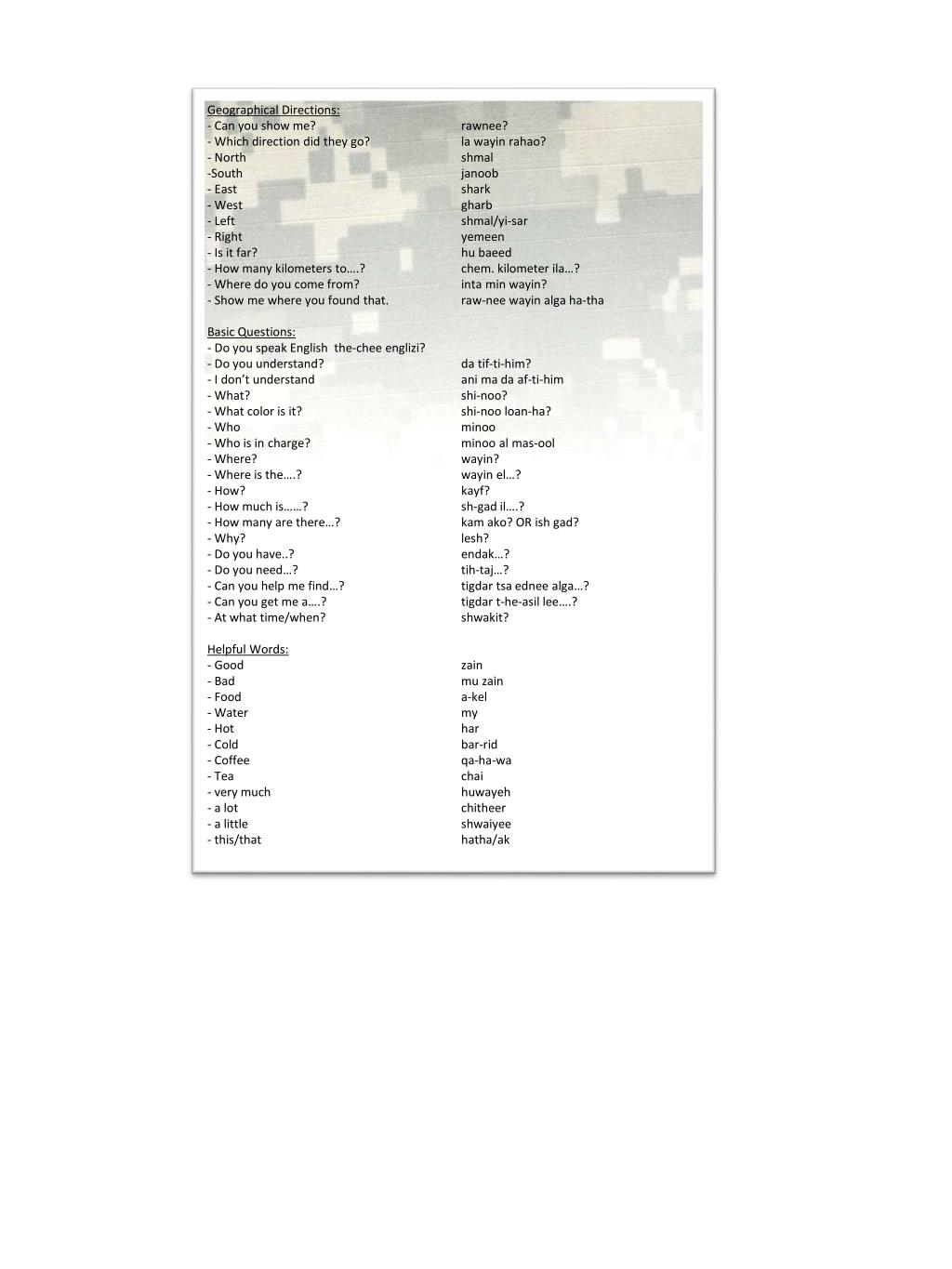 Geographical Directions: • Can you show me? rawnee? • Which direction did they go? la wayinrahao? • North shmal • South janoob • East shark • West gharb • Left shmal/yi-sar • Right yemeen • Is it far? hubaeed • How many kilometers to….? chem. kilometer ila…? • Where do you come from? inta min wayin? • Show me where you found that. raw-nee wayin alga ha-tha • Basic Questions: • Do you speak English the-cheeenglizi? • Do you understand? datif-ti-him? • I don’t understand ani ma daaf-ti-him • What? shi-noo? • What color is it? shi-noo loan-ha? • Who minoo • Who is in charge? minoo al mas-ool • Where? wayin? • Where is the….? wayin el…? • How? kayf? • How much is……? sh-gad il….? • How many are there…? kamako? OR ish gad? • Why? lesh? • Do you have..? endak…? • Do you need…? tih-taj…? • Can you help me find…? tigdartsaednee alga…? • Can you get me a….? tigdar t-he-asil lee….? • At what time/when? shwakit? • Helpful Words: • Good zain • Bad mu zain • Food a-kel • Water my • Hot har • Cold bar-rid • Coffee qa-ha-wa • Tea chai • very much huwayeh • a lot chitheer • a little shwaiyee • this/that hatha/ak