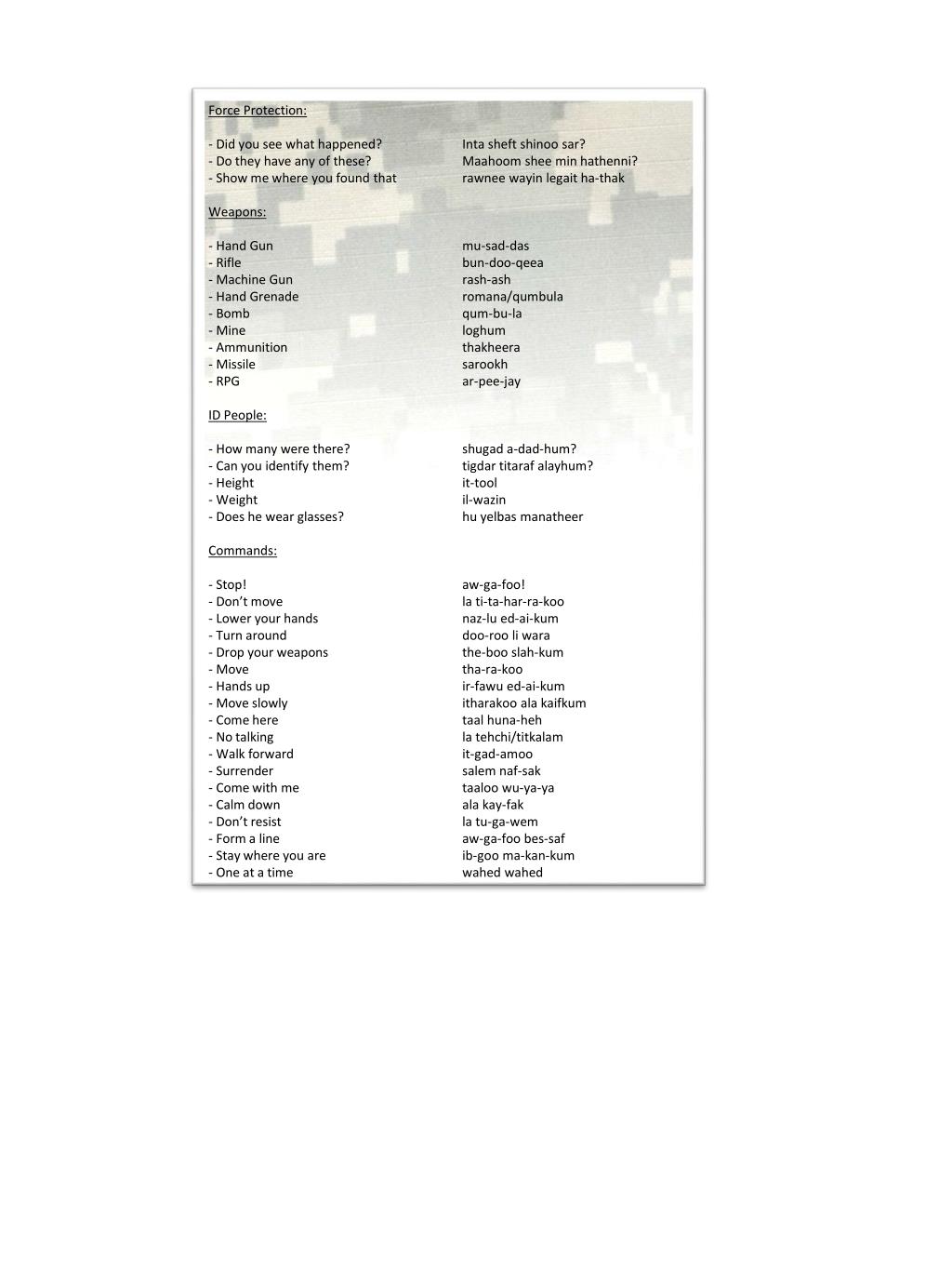 Force Protection: • Did you see what happened? Intasheftshinoosar? • Do they have any of these? Maahoomshee min hathenni? • Show me where you found that rawneewayinlegait ha-thak • Weapons: • Hand Gun mu-sad-das • Rifle bun-doo-qeea • Machine Gun rash-ash • Hand Grenade romana/qumbula • Bomb qum-bu-la • Mine loghum • Ammunition thakheera • Missile sarookh • RPG ar-pee-jay • ID People: • How many were there? shugad a-dad-hum? • Can you identify them? tigdartitarafalayhum? • Height it-tool • Weight il-wazin • Does he wear glasses? huyelbasmanatheer • Commands: • Stop! aw-ga-foo! • Don’t move la ti-ta-har-ra-koo • Lower your hands naz-lued-ai-kum • Turn around doo-rooliwara • Drop your weapons the-boo slah-kum • Move tha-ra-koo • Hands up ir-fawued-ai-kum • Move slowly itharakoo ala kaifkum • Come here taalhuna-heh • No talking la tehchi/titkalam • Walk forward it-gad-amoo • Surrender salemnaf-sak • Come with me taaloowu-ya-ya • Calm down ala kay-fak • Don’t resist la tu-ga-wem • Form a line aw-ga-foobes-saf • Stay where you are ib-goo ma-kan-kum • One at a time wahedwahed