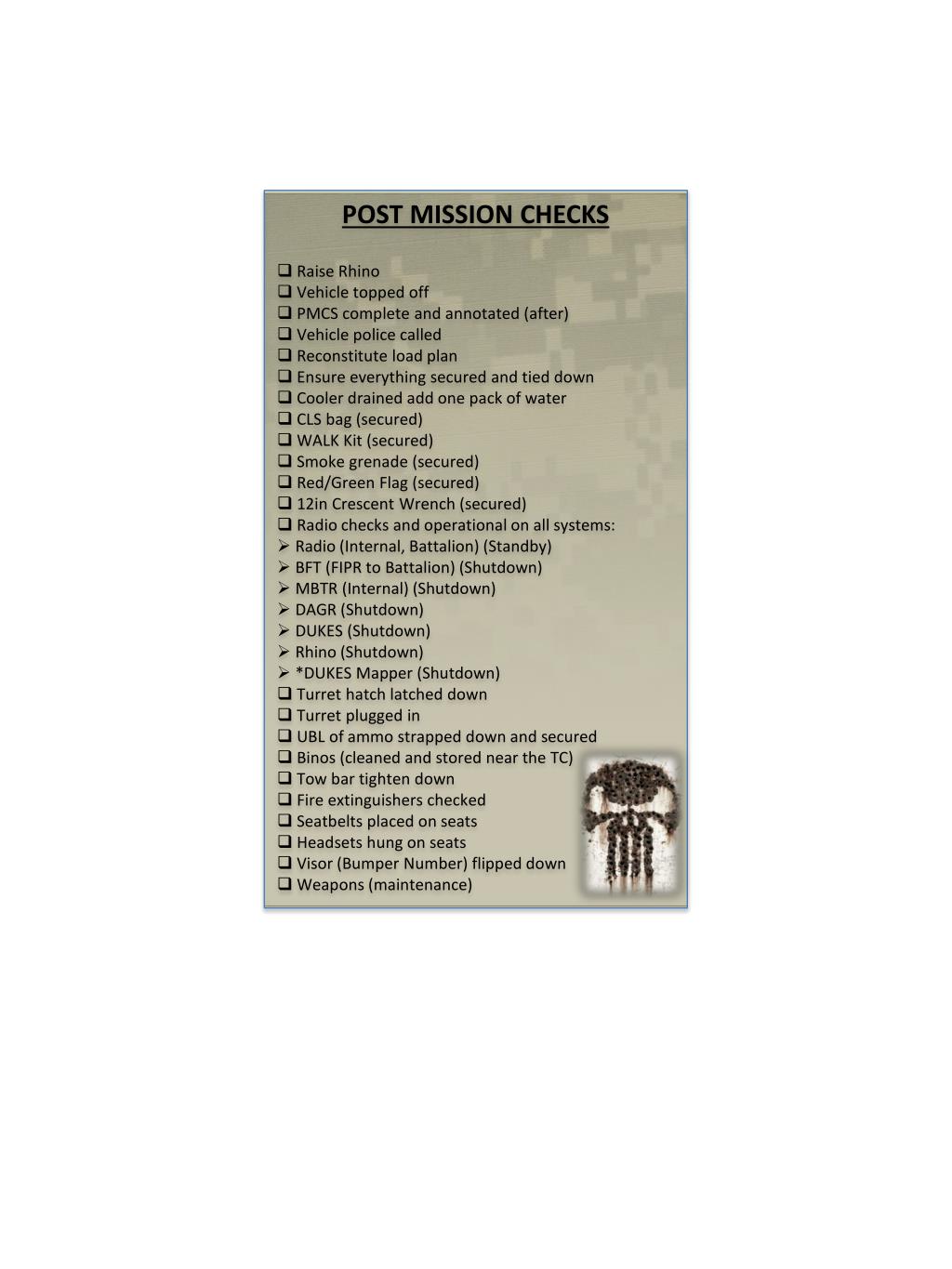 POST MISSION CHECKS • Raise Rhino • Vehicle topped off • PMCS complete and annotated (after) • Vehicle police called • Reconstitute load plan • Ensure everything secured and tied down • Cooler drained add one pack of water • CLS bag (secured) • WALK Kit (secured) • Smoke grenade (secured) • Red/Green Flag (secured) • 12in Crescent Wrench (secured) • Radio checks and operational on all systems: • Radio (Internal, Battalion) (Standby) • BFT (FIPR to Battalion) (Shutdown) • MBTR (Internal) (Shutdown) • DAGR (Shutdown) • DUKES (Shutdown) • Rhino (Shutdown) • *DUKES Mapper (Shutdown) • Turret hatch latched down • Turret plugged in • UBL of ammo strapped down and secured • Binos (cleaned and stored near the TC) • Tow bar tighten down • Fire extinguishers checked • Seatbelts placed on seats • Headsets hung on seats • Visor (Bumper Number) flipped down • Weapons (maintenance)