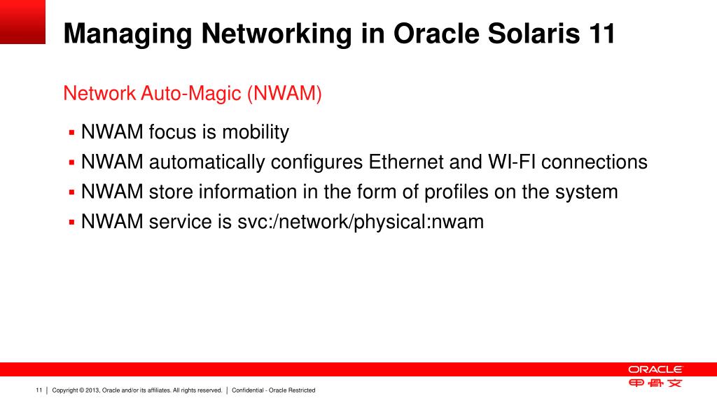 Managing Networking in Oracle Solaris 11 Network Auto-Magic (NWAM) • NWAM focus is mobility • NWAM automatically configures Ethernet and WI-FI connections • NWAM store information in the form of profiles on the system • NWAM service is svc:/network/physical:nwam