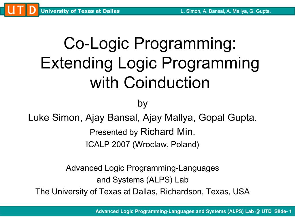 Co-Logic Programming: Extending Logic Programming with Coinduction. by Luke Simon, Ajay Bansal, Ajay Mallya, Gopal Gupta. Presented by Richard Min. ICALP 2007 (Wroclaw, Poland) Advanced Logic Programming-Languages and Systems (ALPS) Lab