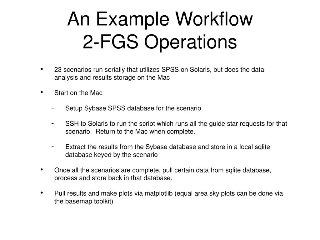 An Example Workflow2-FGS Operations • 23 scenarios run serially that utilizes SPSS on Solaris, but does the data analysis and results storage on the Mac • Start on the Mac • Setup Sybase SPSS database for the scenario • SSH to Solaris to run the script which runs all the guide star requests for that scenario. Return to the Mac when complete. • Extract the results from the Sybase database and store in a local sqlite database keyed by the scenario • Once all the scenarios are complete, pull certain data from sqlite database, process and store back in that database. • Pull results and make plots via matplotlib (equal area sky plots can be done via the basemap toolkit)