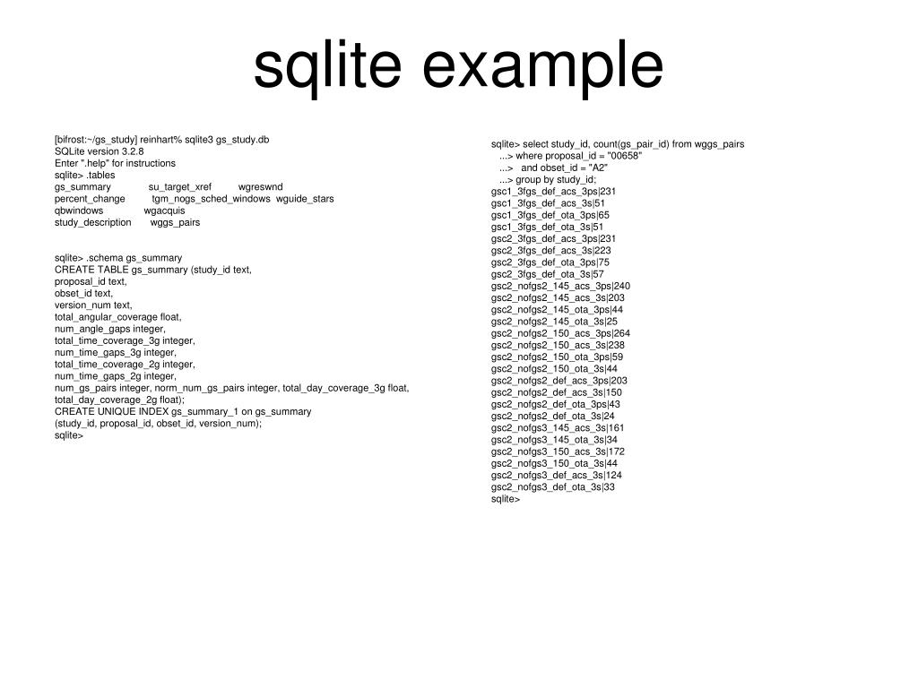 sqlite example [bifrost:~/gs_study] reinhart% sqlite3 gs_study.db SQLite version 3.2.8 Enter ".help" for instructions sqlite> .tables gs_summary su_target_xref wgreswnd percent_change tgm_nogs_sched_windows wguide_stars qbwindows wgacquis study_description wggs_pairs sqlite> .schema gs_summary CREATE TABLE gs_summary (study_id text, proposal_id text, obset_id text, version_num text, total_angular_coverage float, num_angle_gaps integer, total_time_coverage_3g integer, num_time_gaps_3g integer, total_time_coverage_2g integer, num_time_gaps_2g integer, num_gs_pairs integer, norm_num_gs_pairs integer, total_day_coverage_3g float, total_day_coverage_2g float); CREATE UNIQUE INDEX gs_summary_1 on gs_summary (study_id, proposal_id, obset_id, version_num); sqlite> sqlite> select study_id, count(gs_pair_id) from wggs_pairs ...> where proposal_id = "00658" ...> and obset_id = "A2" ...> group by study_id; gsc1_3fgs_def_acs_3ps|231 gsc1_3fgs_def_acs_3s|51 gsc1_3fgs_def_ota_3ps|65 gsc1_3fgs_def_ota_3s|51 gsc2_3fgs_def_acs_3ps|231 gsc2_3fgs_def_acs_3s|223 gsc2_3fgs_def_ota_3ps|75 gsc2_3fgs_def_ota_3s|57 gsc2_nofgs2_145_acs_3ps|240 gsc2_nofgs2_145_acs_3s|203 gsc2_nofgs2_145_ota_3ps|44 gsc2_nofgs2_145_ota_3s|25 gsc2_nofgs2_150_acs_3ps|264 gsc2_nofgs2_150_acs_3s|238 gsc2_nofgs2_150_ota_3ps|59 gsc2_nofgs2_150_ota_3s|44 gsc2_nofgs2_def_acs_3ps|203 gsc2_nofgs2_def_acs_3s|150 gsc2_nofgs2_def_ota_3ps|43 gsc2_nofgs2_def_ota_3s|24 gsc2_nofgs3_145_acs_3s|161 gsc2_nofgs3_145_ota_3s|34 gsc2_nofgs3_150_acs_3s|172 gsc2_nofgs3_150_ota_3s|44 gsc2_nofgs3_def_acs_3s|124 gsc2_nofgs3_def_ota_3s|33 sqlite>