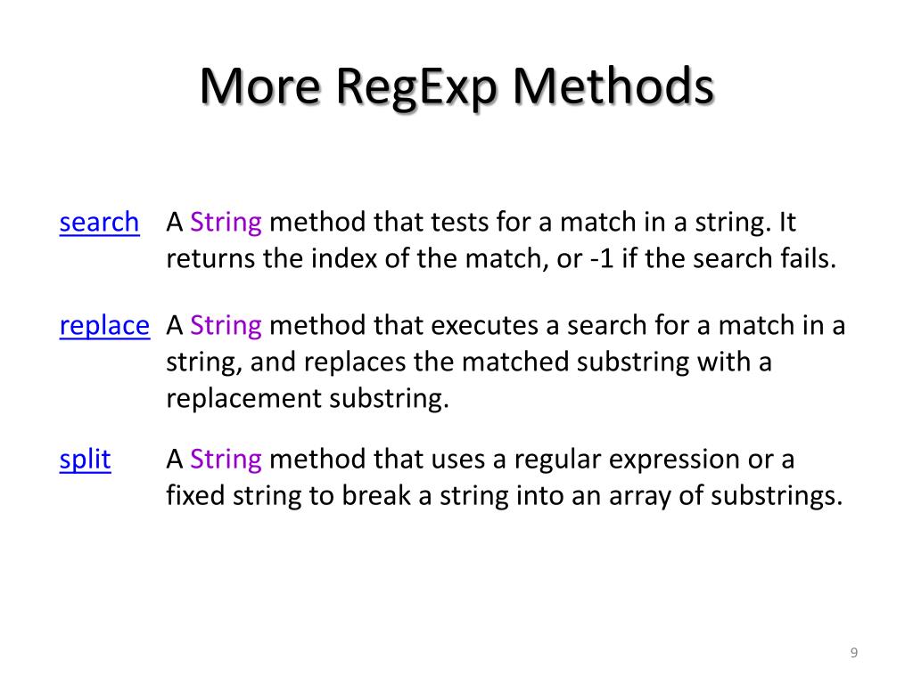 StringMethod – match() • Example 2 • Example 3 varstr = "Welcome to Toronto"; varpatt1 = /to/g; // g: do a global search var result = str.match(patt1); alert(result); // to,to varstr = "Welcome to Toronto"; var patt1 = /to/ig; // ig: global and case-insensitive varmyArray = str.match(patt1); varmsg = ""; for(vari=0; i<myArray.length; i++) { msg += "Found " + myArray[i] + "\n"; } alert(msg); // Found to // Found To // Found to