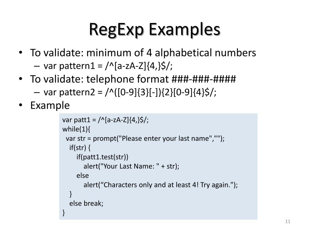 RegExp Examples • To validate: minimum of 4 alphabetical numbers • var pattern1 = /^[a-zA-Z]{4,}$/; • To validate: telephone format ###-###-#### • varpattern2 = /^([0-9]{3}[-]){2}[0-9]{4}$/; • Example var patt1 = /^[a-zA-Z]{4,}$/; while(1){ varstr = prompt("Please enter your last name",""); if(str) { if(patt1.test(str)) alert("Your Last Name: " + str); else alert(“Characters only and at least 4! Try again."); } else break; }