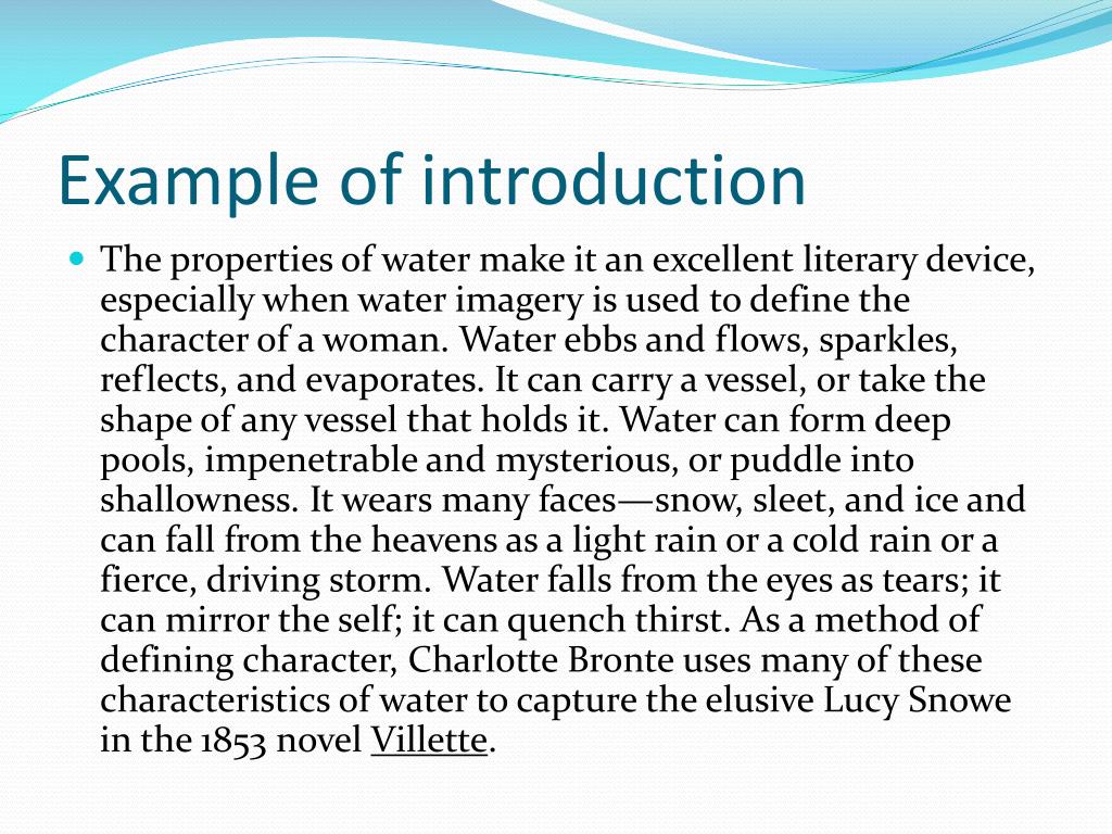 Example of introduction • The properties of water make it an excellent literary device, especially when water imagery is used to define the character of a woman. Water ebbs and flows, sparkles, reflects, and evaporates. It can carry a vessel, or take the shape of any vessel that holds it. Water can form deep pools, impenetrable and mysterious, or puddle into shallowness. It wears many faces—snow, sleet, and ice and can fall from the heavens as a light rain or a cold rain or a fierce, driving storm. Water falls from the eyes as tears; it can mirror the self; it can quench thirst. As a method of defining character, Charlotte Bronte uses many of these characteristics of water to capture the elusive Lucy Snowe in the 1853 novel Villette.