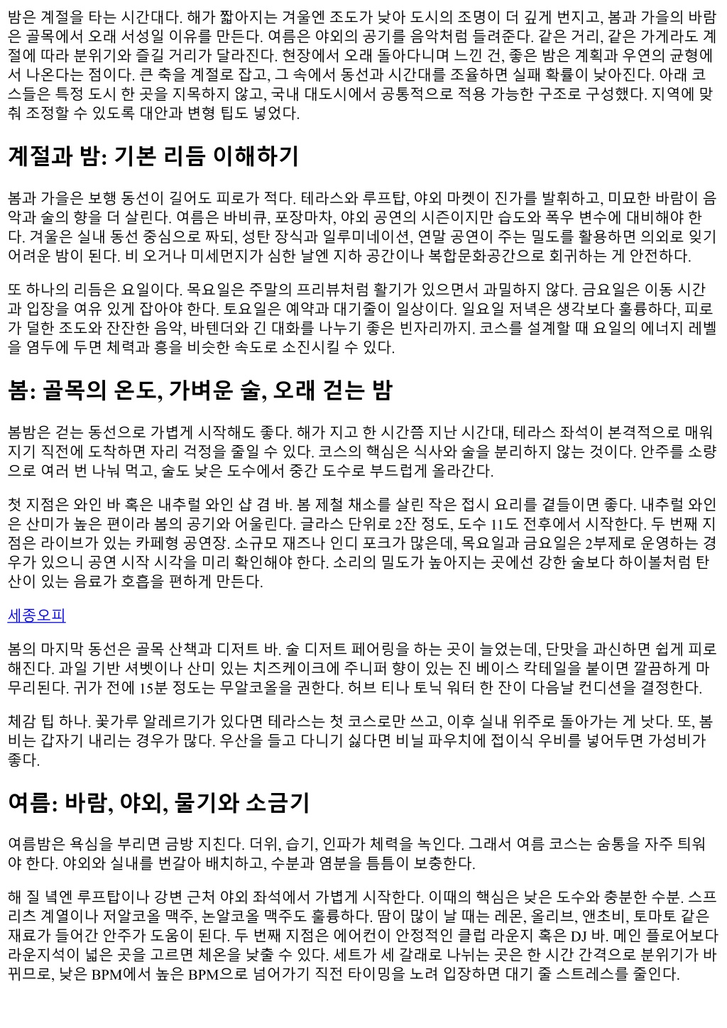 밤은계절을타는시간대다. 해가짧아지는겨울엔조도가낮아도시의조명이더깊게번지고, 봄과가을의바람 은골목에서오래서성일이유를만든다. 여름은야외의공기를음악처럼들려준다. 같은거리, 같은가게라도계 절에따라분위기와즐길거리가달라진다. 현장에서오래돌아다니며느낀건, 좋은밤은계획과우연의균형에 서나온다는점이다. 큰축을계절로잡고, 그속에서동선과시간대를조율하면실패확률이낮아진다. 아래코 스들은특정도시한곳을지목하지않고, 국내대도시에서공통적으로적용가능한구조로구성했다. 지역에맞 춰조정할수있도록대안과변형팁도넣었다. 계절과밤: 기본리듬이해하기 봄과가을은보행동선이길어도피로가적다. 테라스와루프탑, 야외마켓이진가를발휘하고, 미묘한바람이음 악과술의향을더살린다. 여름은바비큐, 포장마차, 야외공연의시즌이지만습도와폭우변수에대비해야한 다. 겨울은실내동선중심으로짜되, 성탄장식과일루미네이션, 연말공연이주는밀도를활용하면의외로잊기 어려운밤이된다. 비오거나미세먼지가심한날엔지하공간이나복합문화공간으로회귀하는게안전하다. 또하나의리듬은요일이다. 목요일은주말의프리뷰처럼활기가있으면서과밀하지않다. 금요일은이동시간 과입장을여유있게잡아야한다. 토요일은예약과대기줄이일상이다. 일요일저녁은생각보다훌륭하다, 피로 가덜한조도와잔잔한음악, 바텐더와긴대화를나누기좋은빈자리까지. 코스를설계할때요일의에너지레벨 을염두에두면체력과흥을비슷한속도로소진시킬수있다. 봄: 골목의온도, 가벼운술, 오래걷는밤 봄밤은걷는동선으로가볍게시작해도좋다. 해가지고한시간쯤지난시간대, 테라스좌석이본격적으로매워 지기직전에도착하면자리걱정을줄일수있다. 코스의핵심은식사와술을분리하지않는것이다. 안주를소량 으로여러번나눠먹고, 술도낮은도수에서중간도수로부드럽게올라간다. 첫지점은와인바혹은내추럴와인샵겸바. 봄제철채소를살린작은접시요리를곁들이면좋다. 내추럴와인 은산미가높은편이라봄의공기와어울린다. 글라스단위로 2잔정도, 도수 11도전후에서시작한다. 두번째지 점은라이브가있는카페형공연장. 소규모재즈나인디포크가많은데, 목요일과금요일은 2부제로운영하는경 우가있으니공연시작시각을미리확인해야한다. 소리의밀도가높아지는곳에선강한술보다하이볼처럼탄 산이있는음료가호흡을편하게만든다. 세종오피 봄의마지막동선은골목산책과디저트바. 술디저트페어링을하는곳이늘었는데, 단맛을과신하면쉽게피로 해진다. 과일기반셔벳이나산미있는치즈케이크에주니퍼향이있는진베이스칵테일을붙이면깔끔하게마 무리된다. 귀가전에 15분정도는무알코올을권한다. 허브티나토닉워터한잔이다음날컨디션을결정한다. 체감팁하나. 꽃가루알레르기가있다면테라스는첫코스로만쓰고, 이후실내위주로돌아가는게낫다. 또, 봄 비는갑자기내리는경우가많다. 우산을들고다니기싫다면비닐파우치에접이식우비를넣어두면가성비가 좋다. 여름: 바람, 야외, 물기와소금기 여름밤은욕심을부리면금방지친다. 더위, 습기, 인파가체력을녹인다. 그래서여름코스는숨통을자주틔워 야한다. 야외와실내를번갈아배치하고, 수분과염분을틈틈이보충한다. 해질녘엔루프탑이나강변근처야외좌석에서가볍게시작한다. 이때의핵심은낮은도수와충분한수분. 스프 리츠계열이나저알코올맥주, 논알코올맥주도훌륭하다. 땀이많이날때는레몬, 올리브, 앤초비, 토마토같은 재료가들어간안주가도움이된다. 두번째지점은에어컨이안정적인클럽라운지혹은 DJ 바. 메인플로어보다 라운지석이넓은곳을고르면체온을낮출수있다. 세트가세갈래로나뉘는곳은한시간간격으로분위기가바 뀌므로, 낮은 BPM에서높은 BPM으로넘어가기직전타이밍을노려입장하면대기줄스트레스를줄인다.