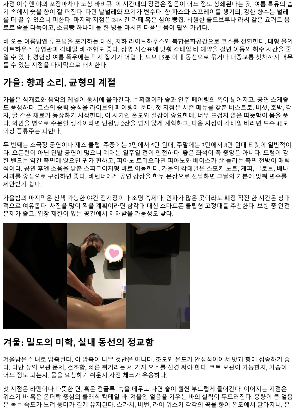 자정이후엔야외포장마차나노상바비큐. 이시간대의장점은잡음이어느정도상쇄된다는것. 여름특유의습 기속에서숯불향이잘퍼진다. 다만날벌레와모기가변수다. 향파스와스프레이를챙기되, 강한향수는벌레 를더끌수있으니피한다. 마지막지점은 24시간카페혹은심야빵집. 시원한콜드브루나라씨같은요거트음 료로속을다독이고, 소금빵하나에물한병을마시면다음날몸이훨씬가볍다. 비오는여름밤엔루프탑을포기하는대신, 지하라이브하우스와복합문화공간으로코스를전환한다. 대형몰의 아트하우스상영관과칵테일바조합도좋다. 상영시간표에맞춰칵테일바예약을걸면이동의허수시간을줄 일수있다. 경험상여름폭우에는택시잡기가어렵다. 도보 15분이내동선으로묶거나대중교통첫차까지머무 를수있는지점을마지막으로배치한다. 가을: 향과소리, 균형의계절 가을은식재료와음악의레벨이동시에올라간다. 수확철이라술과안주페어링의폭이넓어지고, 공연스케줄 도풍성하다. 코스의중력중심을라이브와페어링에둔다. 첫지점은시즌메뉴를갖춘비스트로. 버섯, 호박, 감 자, 굴같은재료가등장하기시작한다. 이시기엔온도와질감이중요한데, 너무뜨겁지않은따뜻함이몸을푼 다. 와인을병으로주문할생각이라면인원당 2잔을넘지않게계획하고, 다음지점이칵테일바라면도수 40도 이상증류주는피한다. 두번째는소극장공연이나재즈클럽. 주중에는 2만에서 5만원대, 주말에는 3만에서 8만원대티켓이일반적이 다. 오픈런이아닌단발공연이많으니예매는일주일전이안전하다. 좋은좌석이꼭중앙은아니다. 드럼이강 한밴드는약간측면에앉으면귀가편하고, 피아노트리오라면피아노와베이스가잘들리는측면전방이매력 적이다. 공연후엔소음을낮춘스피크이지형바로이동한다. 가을의칵테일은스모키노트, 계피, 클로브, 배나 사과를중심으로구성하면좋다. 바텐더에게공연감상을한두문장으로전달하면그날의기분에맞춰변주를 제안받기쉽다. 가을밤의마지막은산책가능한야간전시장이나조명축제다. 인파가많은곳이라도폐장직전한시간은상대 적으로여유롭다. 사진을많이찍을계획이라면삼각대대신스마트폰클립형고정대를추천한다. 보행중안전 문제가줄고, 입장제한이있는공간에서제재받을가능성도낮다. 겨울: 밀도의미학, 실내동선의정교함 겨울밤은실내로압축된다. 이압축이나쁜것만은아니다. 조도와온도가안정적이어서맛과향에집중하기좋 다. 다만상의보관문제, 건조함, 빠른취기라는세가지요소를신경써야한다. 코트보관이가능한지, 가습이 어느정도되는지, 물을요청하기쉬운지사전체크가유용하다. 첫지점은라멘이나따뜻한면, 혹은전골류. 속을데우고나면술이훨씬부드럽게들어간다. 이어지는지점은 위스키바혹은온더락중심의클래식칵테일바. 겨울엔얼음을키우는바의실력이두드러진다. 용량이큰얼음 은녹는속도가느려풍미가길게유지된다. 스카치, 버번, 라이위스키각각의곡물향이온도에서달라지니, 온