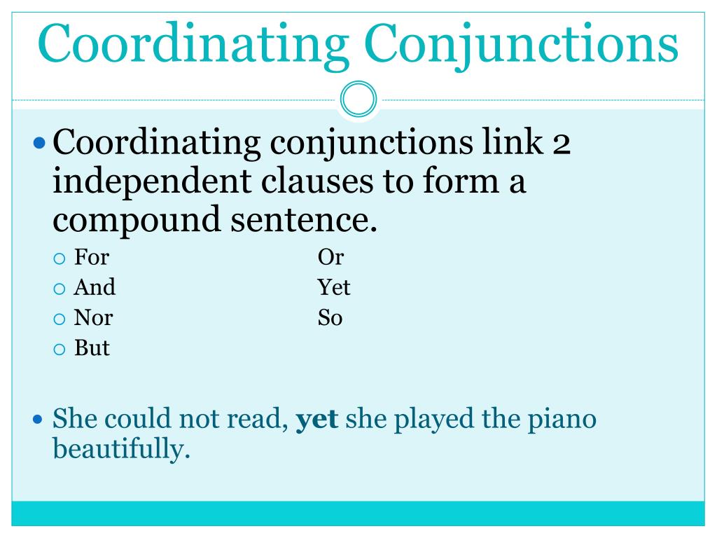 Coordinating Conjunctions • Coordinating conjunctions link 2 independent clauses to form a compound sentence. • For Or • And Yet • Nor So • But • She could not read, yet she played the piano beautifully.