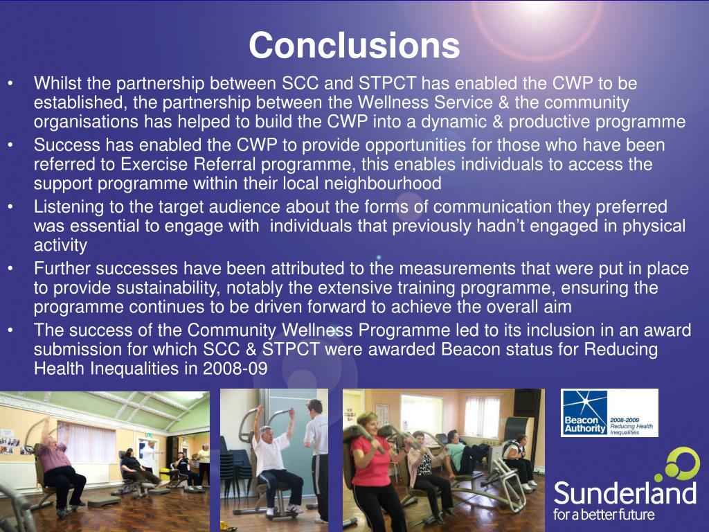 Conclusions • Whilst the partnership between SCC and STPCT has enabled the CWP to be established, the partnership between the Wellness Service & the community organisations has helped to build the CWP into a dynamic & productive programme • Success has enabled the CWP to provide opportunities for those who have been referred to Exercise Referral programme, this enables individuals to access the support programme within their local neighbourhood • Listening to the target audience about the forms of communication they preferred was essential to engage with individuals that previously hadn’t engaged in physical activity • Further successes have been attributed to the measurements that were put in place to provide sustainability, notably the extensive training programme, ensuring the programme continues to be driven forward to achieve the overall aim • The success of the Community Wellness Programme led to its inclusion in an award submission for which SCC & STPCT were awarded Beacon status for Reducing Health Inequalities in 2008-09