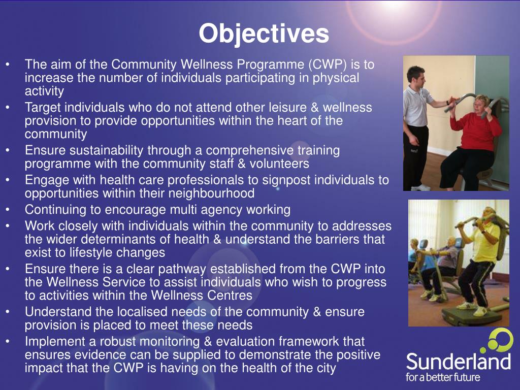 Objectives • The aim of the Community Wellness Programme (CWP) is to increase the number of individuals participating in physical activity • Target individuals who do not attend other leisure & wellness provision to provide opportunities within the heart of the community • Ensure sustainability through a comprehensive training programme with the community staff & volunteers • Engage with health care professionals to signpost individuals to opportunities within their neighbourhood • Continuing to encourage multi agency working • Work closely with individuals within the community to addresses the wider determinants of health & understand the barriers that exist to lifestyle changes • Ensure there is a clear pathway established from the CWP into the Wellness Service to assist individuals who wish to progress to activities within the Wellness Centres • Understand the localised needs of the community & ensure provision is placed to meet these needs • Implement a robust monitoring & evaluation framework that ensures evidence can be supplied to demonstrate the positive impact that the CWP is having on the health of the city