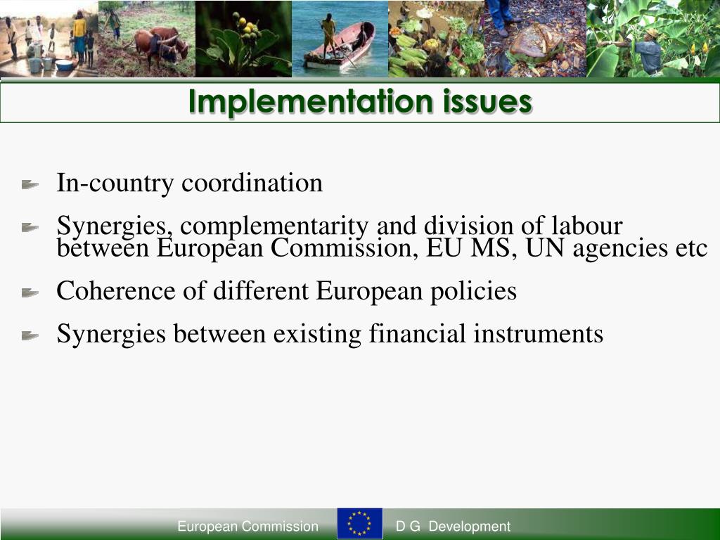 Implementation issues • In-country coordination • Synergies, complementarity and division of labour between European Commission, EU MS, UN agencies etc • Coherence of different European policies • Synergies between existing financial instruments