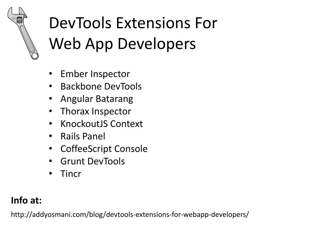 DevTools Extensions For Web App Developers • Ember Inspector • Backbone DevTools • Angular Batarang • Thorax Inspector • KnockoutJS Context • Rails Panel • CoffeeScript Console • Grunt DevTools • Tincr Info at: http://addyosmani.com/blog/devtools-extensions-for-webapp-developers/