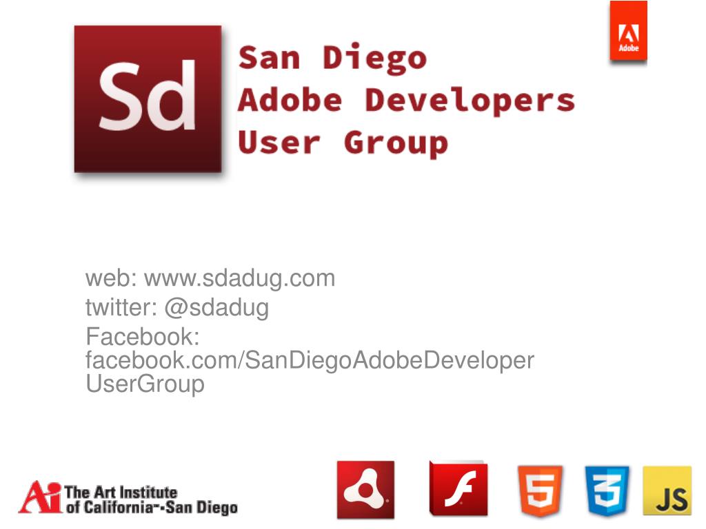 web: www.sdadug.com twitter: @sdadug Facebook: facebook.com/SanDiegoAdobeDeveloperUserGroup