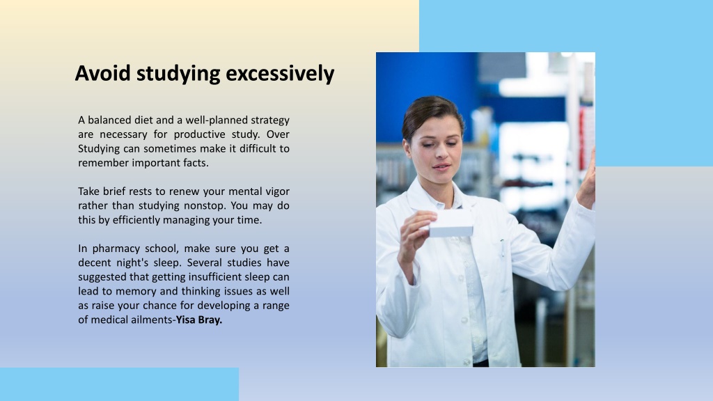 Avoid studying excessively A balanced diet and a well-planned strategy are necessary for productive study. Over Studying can sometimes make it difficult to remember important facts. Take brief rests to renew your mental vigor rather than studying nonstop. You may do this by efficiently managing your time. In pharmacy school, make sure you get a decent night's sleep. Several studies have suggested that getting insufficient sleep can lead to memory and thinking issues as well as raise your chance for developing a range of medical ailments-Yisa Bray.