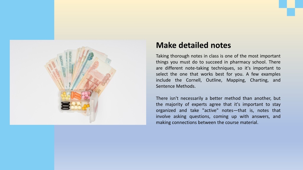 Make detailed notes Taking thorough notes in class is one of the most important things you must do to succeed in pharmacy school. There are different note-taking techniques, so it's important to select the one that works best for you. A few examples include the Cornell, Outline, Mapping, Charting, and Sentence Methods. There isn't necessarily a better method than another, but the majority of experts agree that it's important to stay organized and take "active" notes—that is, notes that involve asking questions, coming up with answers, and making connections between the course material.