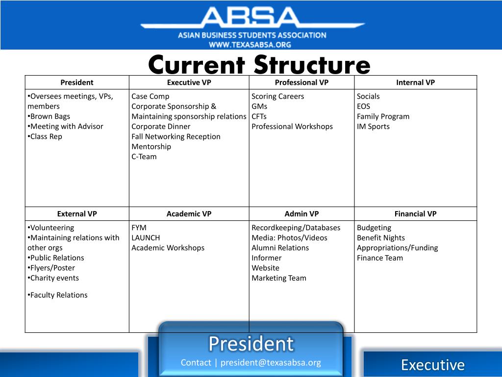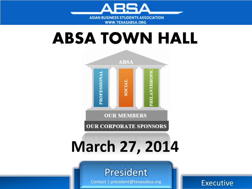 Join us for the ABSA Town Hall on March 27, 2014. We will open with introductions of new amendments followed by a demonstration comparing the current structure to the new structure. This session aims to provide clear explanations of the changes, highlighting the benefits and implications. There will be opportunities for Q&A regarding both the current and new structures. Your feedback and questions are encouraged as we explore the future of our organization. Don't miss this important event!