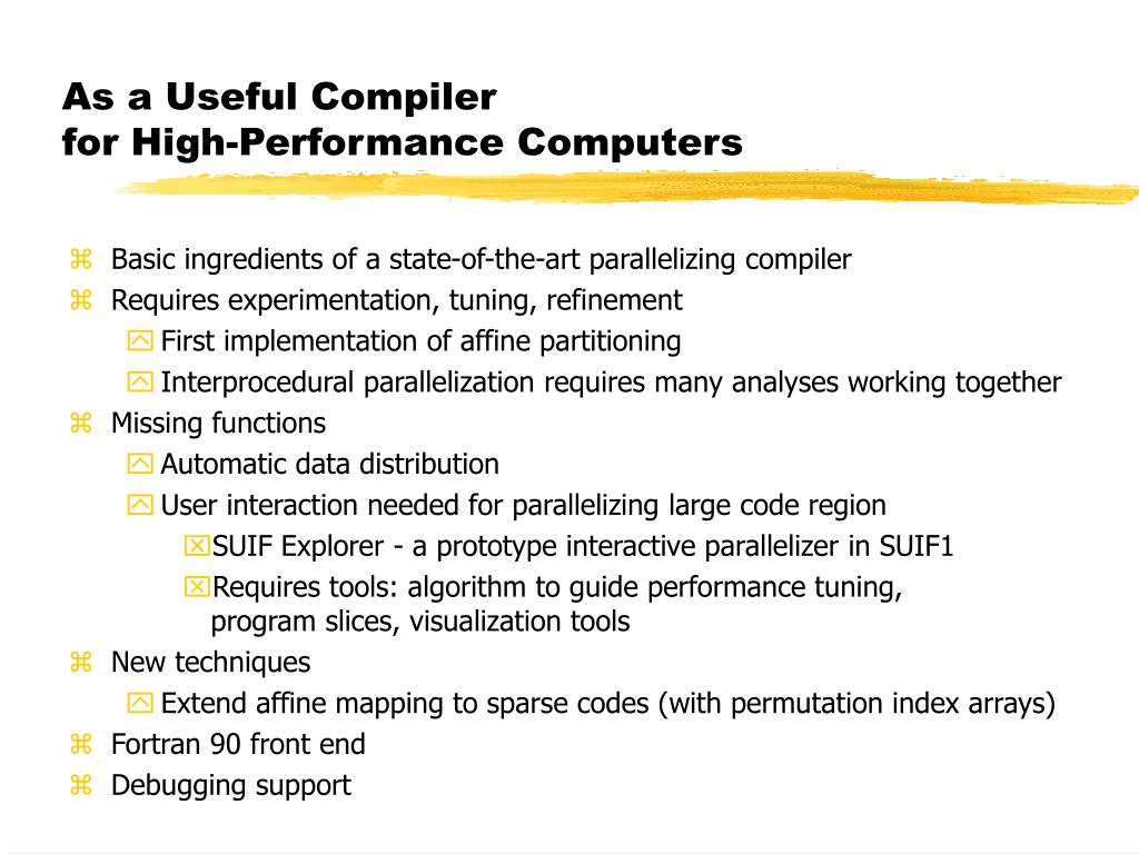 Basic ingredients of a state-of-the-art parallelizing compiler Requires experimentation, tuning, refinement First implementation of affine partitioning Interprocedural parallelization requires many analyses working together Missing functions Automatic data distribution User interaction needed for parallelizing large code region SUIF Explorer - a prototype interactive parallelizer in SUIF1 Requires tools: algorithm to guide performance tuning, program slices, visualization tools New techniques Extend affine mapping to sparse codes (with permutation index arrays) Fortran 90 front end Debugging support As a Useful Compiler for High-Performance Computers