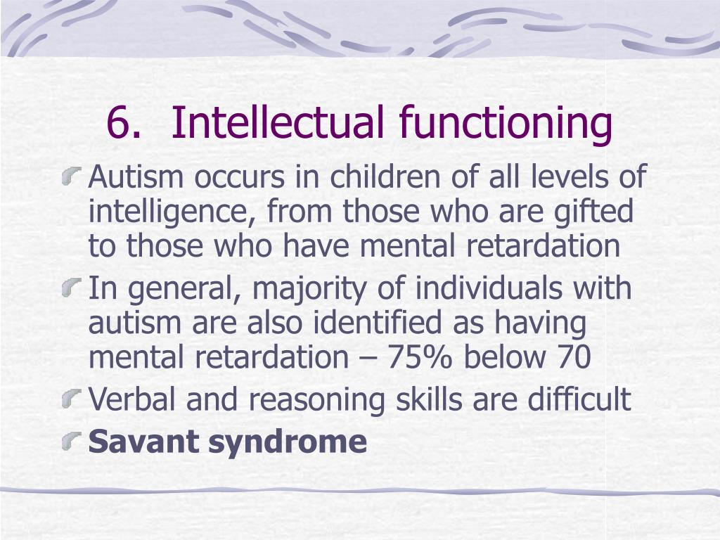 6. Intellectual functioning • Autism occurs in children of all levels of intelligence, from those who are gifted to those who have mental retardation • In general, majority of individuals with autism are also identified as having mental retardation – 75% below 70 • Verbal and reasoning skills are difficult • Savant syndrome