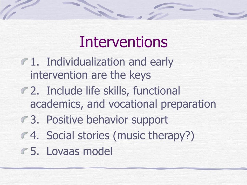 Interventions • 1. Individualization and early intervention are the keys • 2. Include life skills, functional academics, and vocational preparation • 3. Positive behavior support • 4. Social stories (music therapy?) • 5. Lovaas model