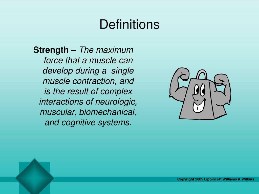 Definitions Strength– The maximum force that a muscle can develop during a single muscle contraction, and is the result of complex interactions of neurologic, muscular, biomechanical, and cognitive systems.