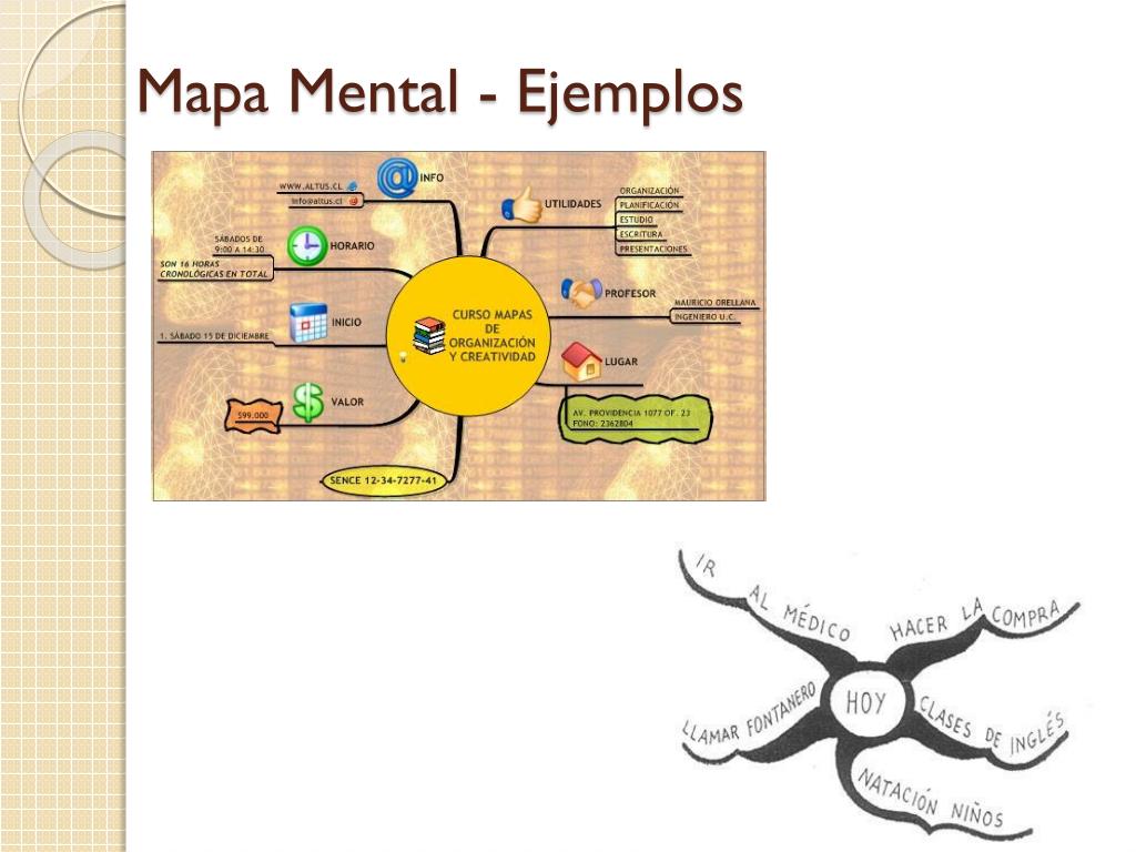 Mapa Mental • Desarrollada por el Británico Tony Buzan. • Herramienta para memorización, organización y representación de información. • Propósito Principal: • Facilitar el proceso de Aprendizaje • Administración y planeación organizacional • Toma de decisiones • Las técnicas de ordenamiento de la información es lo que nos permite representar nuestras ideas de forma armónica las funciones cognitivas de los hemisferios cerebrales .