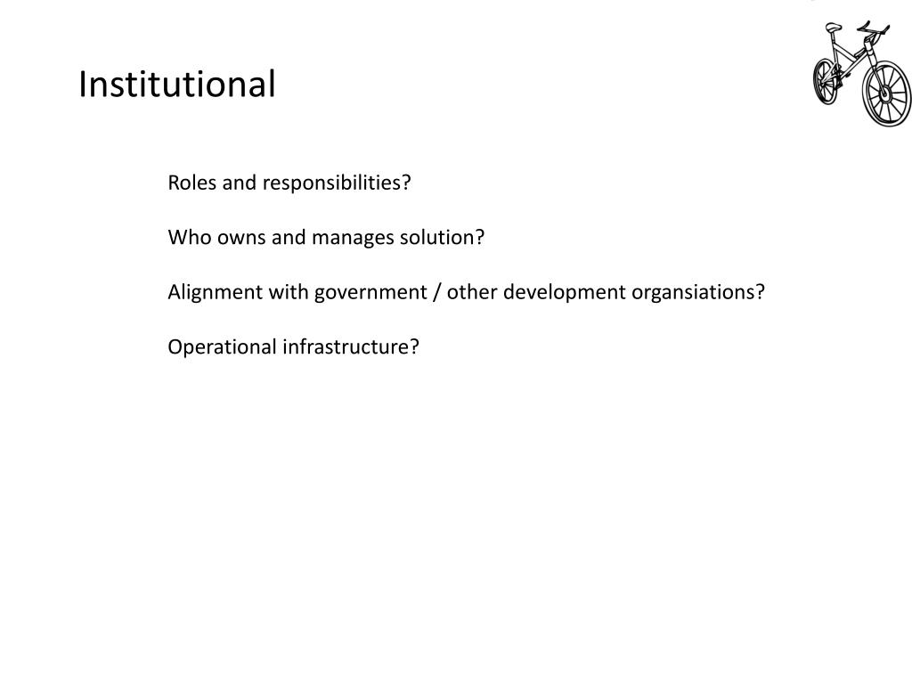Institutional Roles and responsibilities? Who owns and manages solution? Alignment with government / other development organsiations? Operational infrastructure?