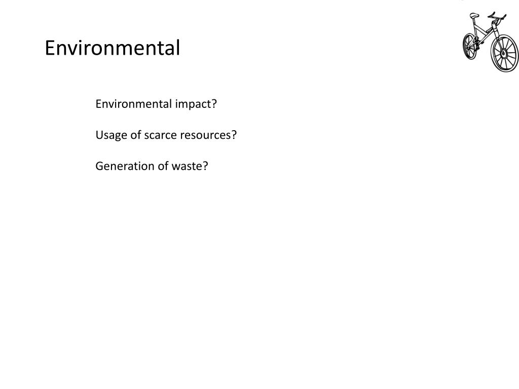 Environmental Environmental impact? Usage of scarce resources? Generation of waste?