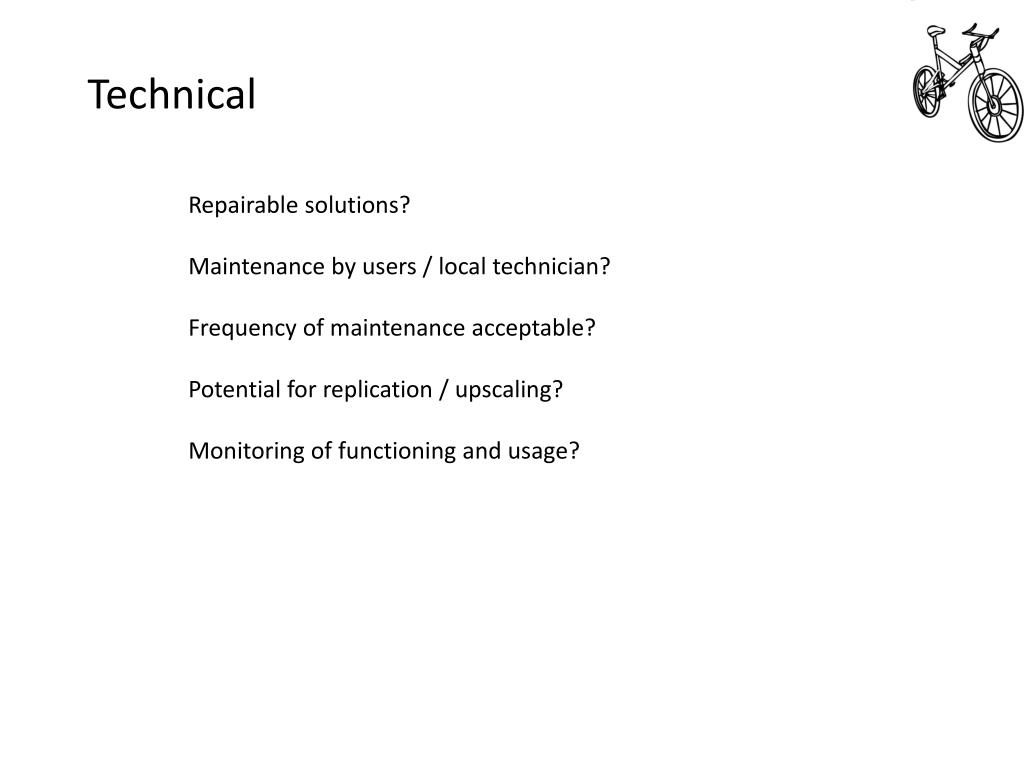 Technical Repairable solutions? Maintenance by users / local technician? Frequency of maintenance acceptable? Potential for replication / upscaling? Monitoring of functioning and usage?