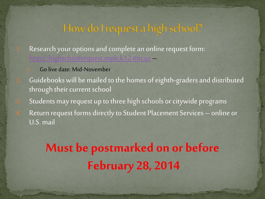 How do I request a high school? • Research your options and complete an online request form: http://highschoolrequest.mpls.k12.mn.us – • Go live date: Mid-November • Guidebooks will be mailed to the homes of eighth-graders and distributed through their current school • Students may request up to three high schools or citywide programs • Return request forms directly to Student Placement Services – online or U.S. mail Must be postmarked on or before February 28, 2014
