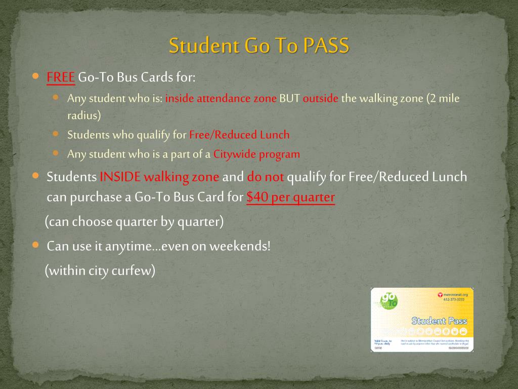 Student Go To PASS • FREEGo-To Bus Cards for: • Any student who is: inside attendance zone BUT outside the walking zone (2 mile radius) • Students who qualify for Free/Reduced Lunch • Any student who is a part of a Citywide program • Students INSIDE walking zone and do not qualify for Free/Reduced Lunch can purchase a Go-To Bus Card for $40 per quarter (can choose quarter by quarter) • Can use it anytime...even on weekends! (within city curfew)