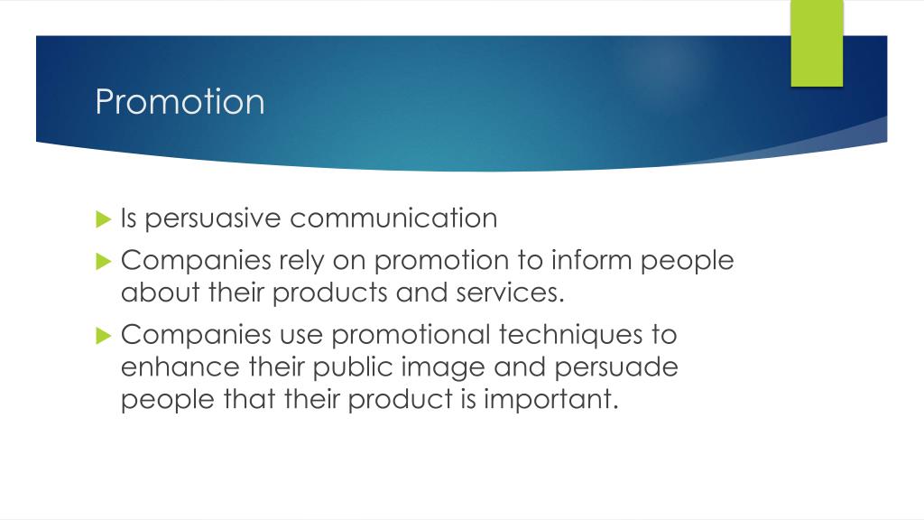 Promotion • Is persuasive communication • Companies rely on promotion to inform people about their products and services. • Companies use promotional techniques to enhance their public image and persuade people that their product is important.