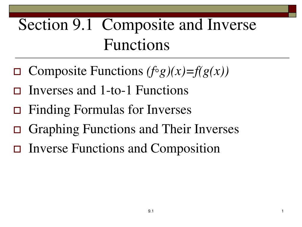 Section 9.1 Composite and Inverse Functions. Composite Functions (f ◦ g)(x)=f(g(x)) Inverses and 1-to-1 Functions Finding Formulas for Inverses Graphing Functions and Their Inverses Inverse Functions and Composition. Two Functions: Concept and Notation for Composition.