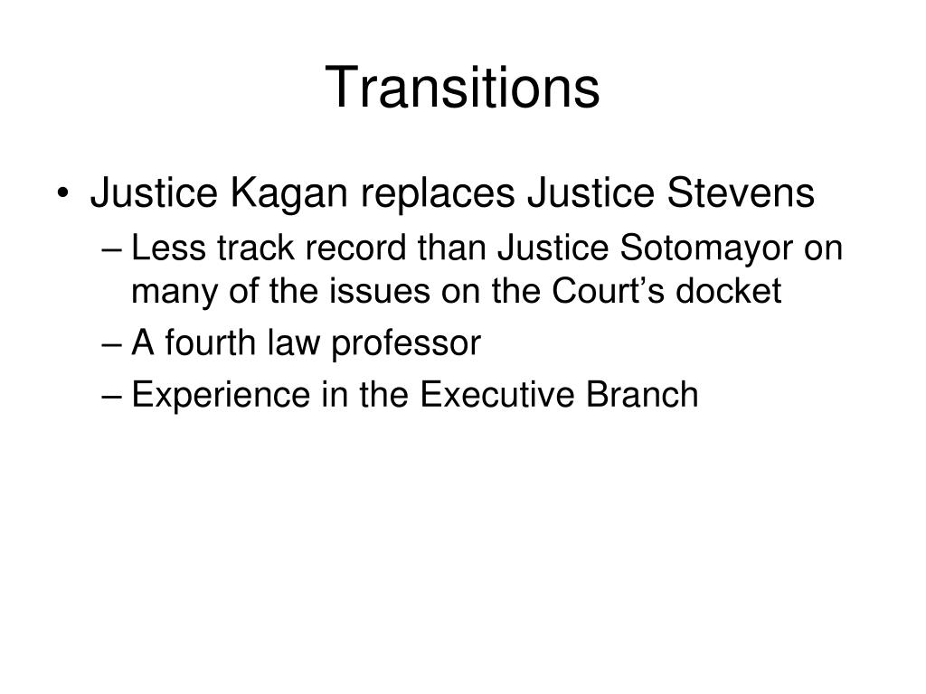 Transitions • Justice Kagan replaces Justice Stevens • Less track record than Justice Sotomayor on many of the issues on the Court’s docket • A fourth law professor