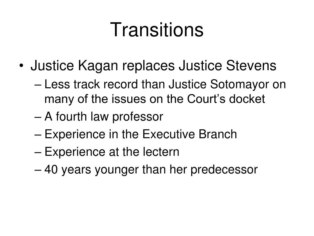 Transitions • Justice Kagan replaces Justice Stevens • Less track record than Justice Sotomayor on many of the issues on the Court’s docket • A fourth law professor • Experience in the Executive Branch • Experience at the lectern • 40 years younger than her predecessor • Retirement…