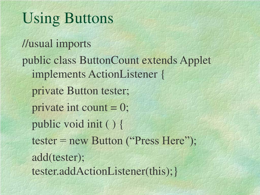 Using Buttons //usual imports public class ButtonCount extends Applet implements ActionListener { private Button tester; private int count = 0; public void init ( ) { tester = new Button (“Press Here”); add(tester); tester.addActionListener(this);}