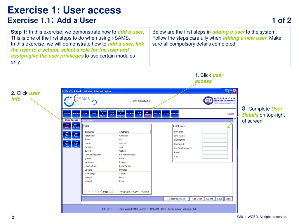 i-SAMS Training Manual . Date: March 2012 Version : 2. Exercise 1: User access . Exercise 1.1 : Add a User 1 of 2.