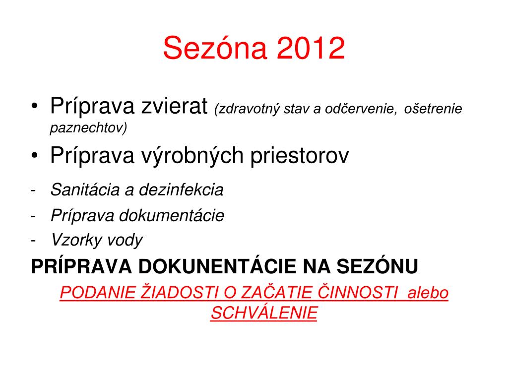 Sezóna 2012 • Príprava zvierat (zdravotný stav a odčervenie,ošetrenie paznechtov) • Príprava výrobných priestorov • Sanitácia a dezinfekcia • Príprava dokumentácie • Vzorky vody PRÍPRAVA DOKUNENTÁCIE NA SEZÓNU PODANIE ŽIADOSTI O ZAČATIE ČINNOSTI alebo SCHVÁLENIE