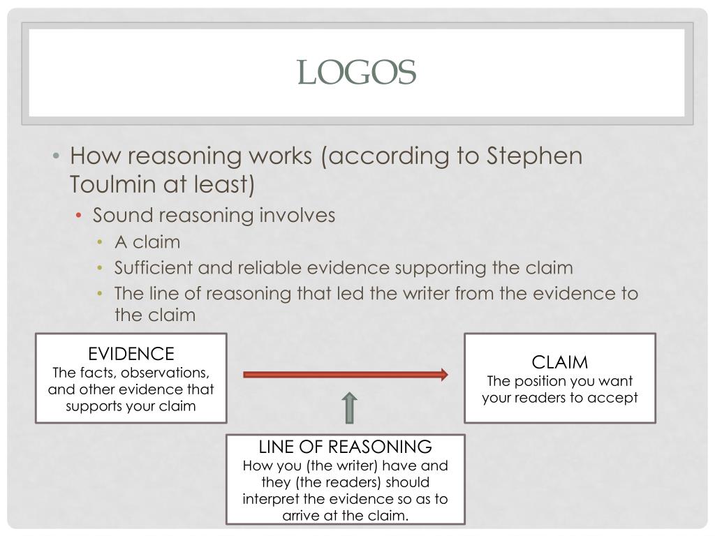 Logos • How reasoning works (according to Stephen Toulmin at least) • Sound reasoning involves • A claim • Sufficient and reliable evidence supporting the claim • The line of reasoning that led the writer from the evidence to the claim EVIDENCE The facts, observations, and other evidence that supports your claim CLAIM The position you want your readers to accept LINE OF REASONING How you (the writer) have and they (the readers) should interpret the evidence so as to arrive at the claim.
